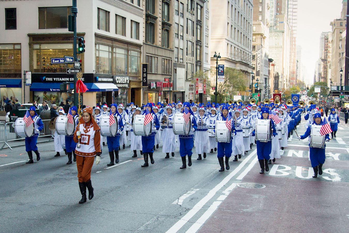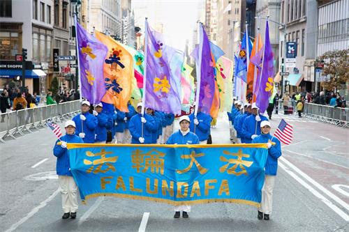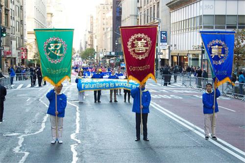 【明慧网二零一八年十一月十三日】二零一八年十一月十一日,纽约退伍军人节大游行在曼哈顿最繁华的第五大道盛大举行。今年的主题是纪念第一次世界大战结束一百周年。活动共有超过三百个团体、逾2.5万人参加。游行从上午开始,从纽约曼哈顿的著名街道第五大道上的26街出发,抵达46街的终点,历时整整四个小时,吸引大约五十万现场观众。第十五年受邀参加的法轮功学员们,组成了最为庞大、壮观的队伍,成为本次游行的亮点之一。