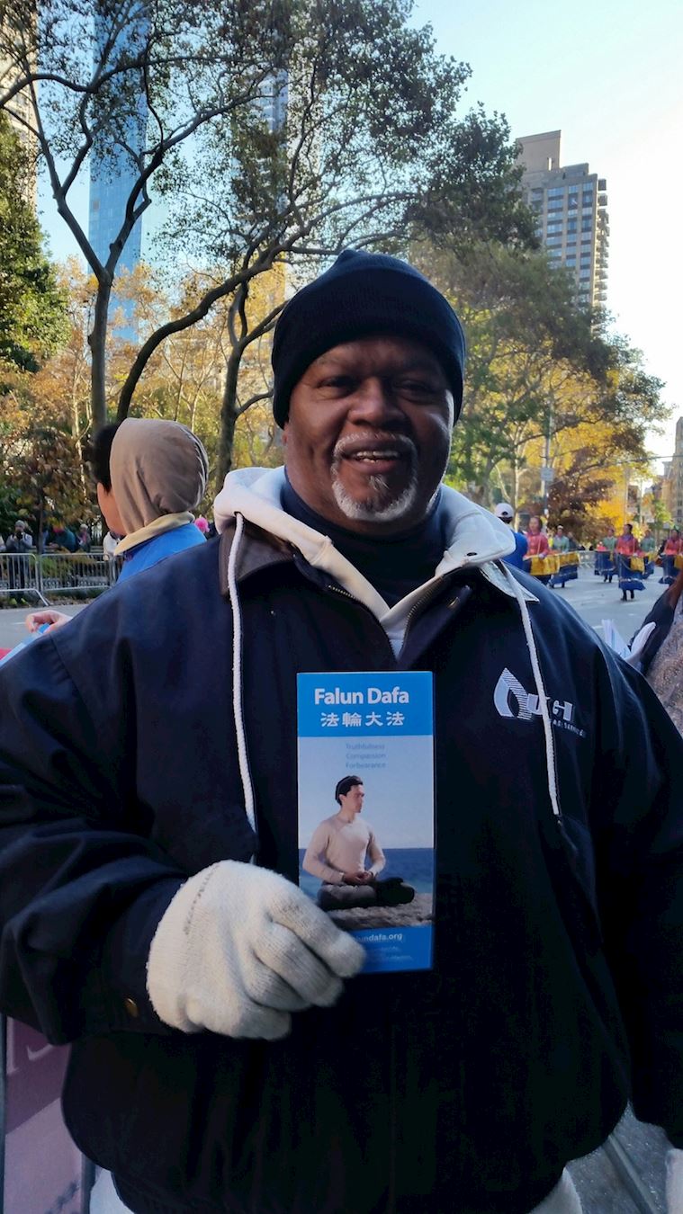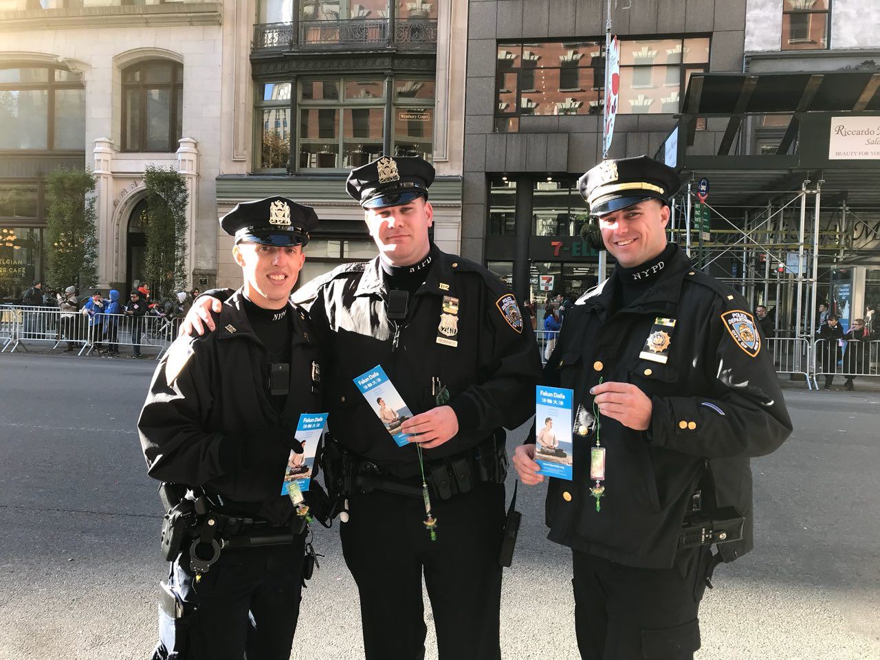 当法轮功学员把法轮功传单和小莲花送给路边执勤的三个警察时,他们愉快地接受并合影留念。高个子警察说:“这两年你们法轮大法日在曼哈顿的游行,我都执勤,希望下一次我还能站在这里。”“我知道在中国(中共)迫害你们,关押你们,来这里(美国)你们不要怕,由我们保护你。”他说。