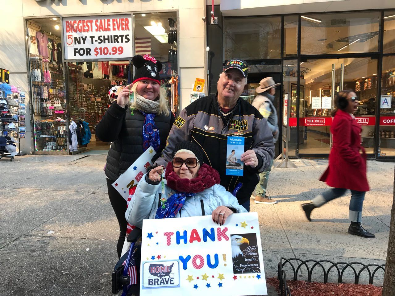 有一家三口从意大利来曼哈顿旅游,爸爸说很荣幸地观看到了老兵节游行,他说:“法轮功的音乐(天国乐团)太棒了。”