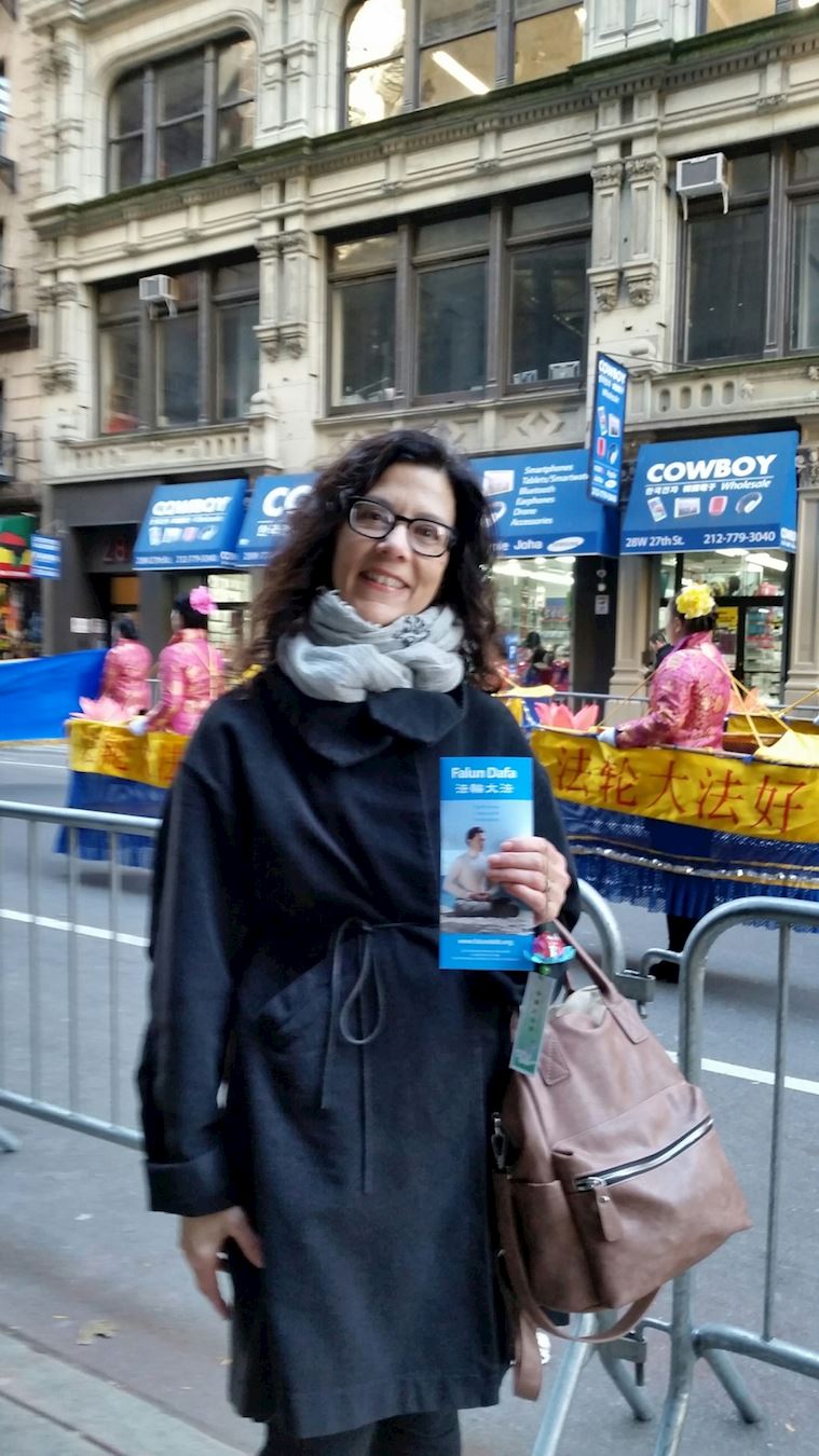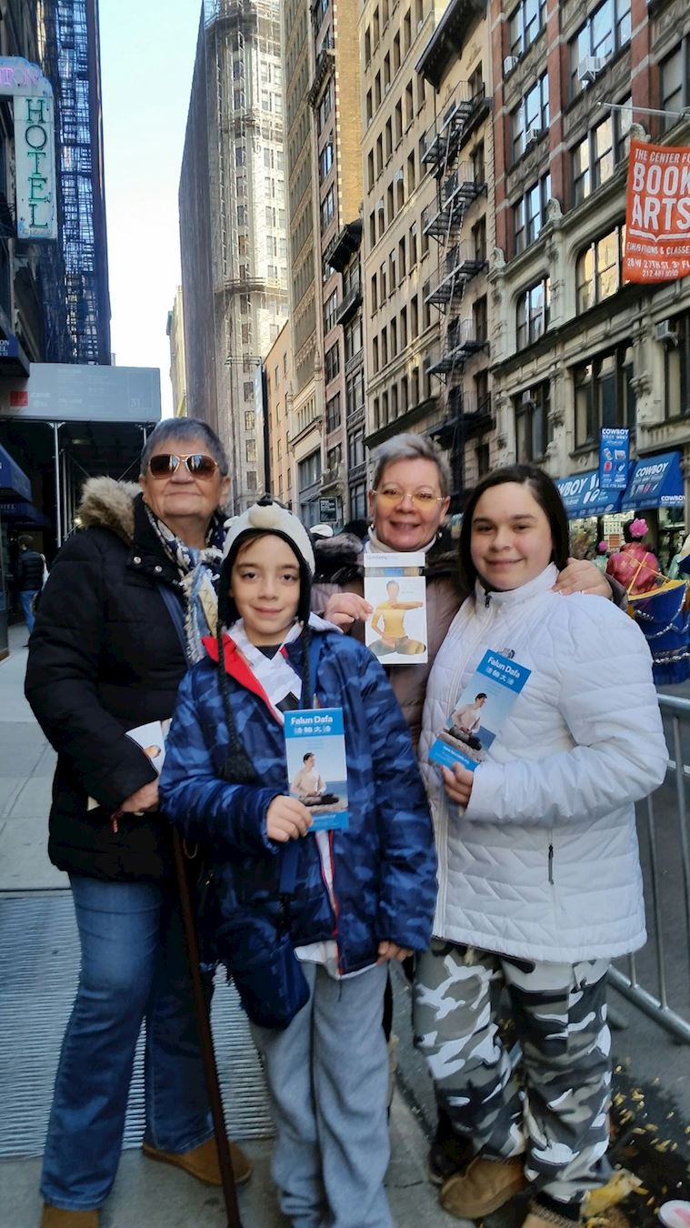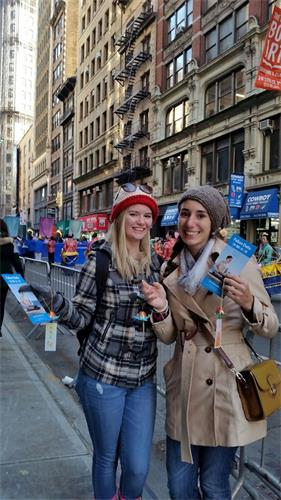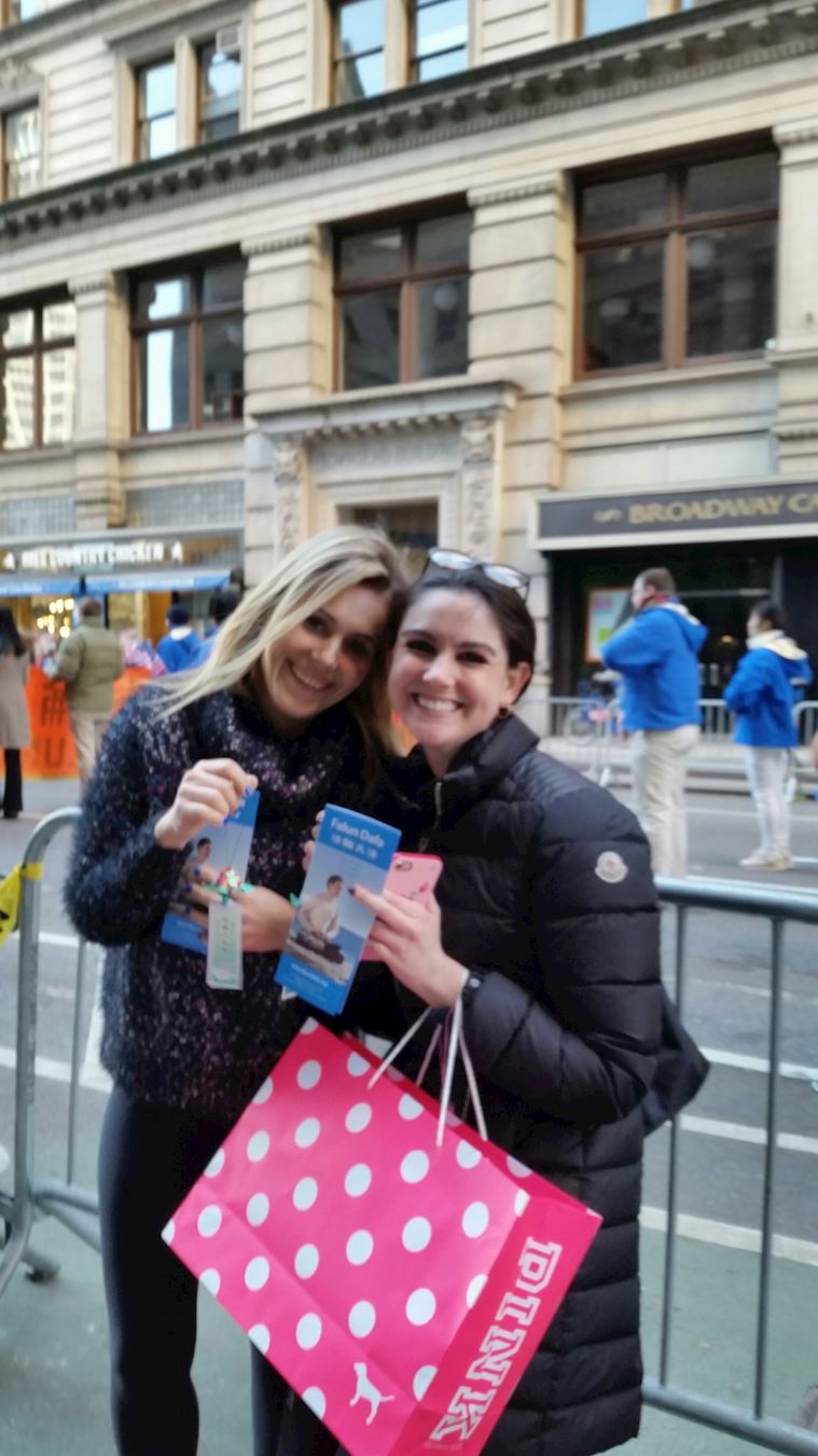 司马兰达(Smaranda)和考特尼(Courtney)在附近的化妆品店上班,听到了一种美妙的乐曲,她们就跑了出来,她们把法轮功的队伍录影下来,分享给朋友。最后她们手捧真相传单,留下了美丽的瞬间。