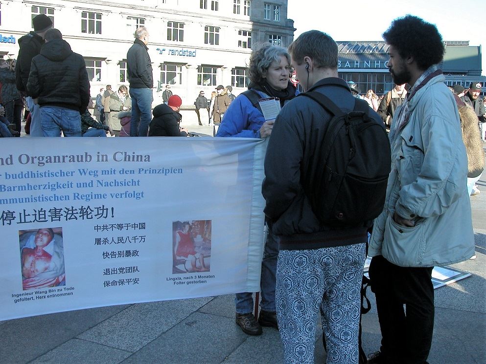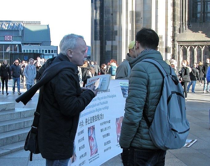 这里地处市中心,火车站边,步行街起点处,在这个晴朗的周六,除了众多的游客,很多科隆附近的居民也来到市中心购买圣诞礼物。许多路人被法轮功学员鲜明的横幅和展板吸引,他们了解到真相后,纷纷为反迫害签名。一些中国游客和留学生也在这里了解到中共对法轮功的迫害,并声明退出中共党、团、队组织。