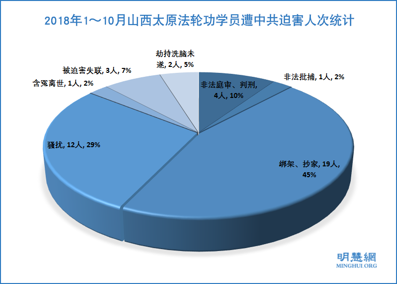 ![]() 图1:2018年1~10月山西太原法轮功学员遭中共迫害人次统计 |