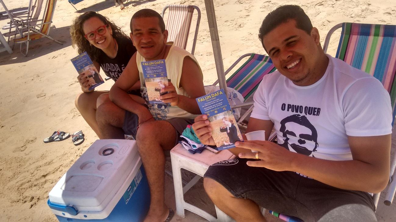 在巴西的假日这一天。学员们来到城市公园炼功点弘法,经过的市民大都拿了真相传单,有的人当时就加入学炼的。