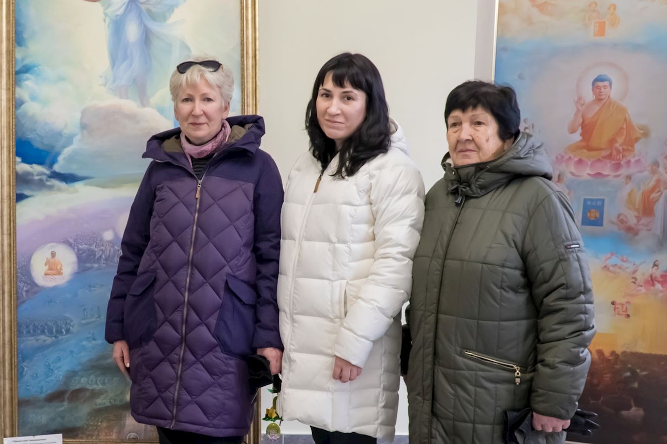 '图1:观看画展的俄罗斯民众手持纸莲花和法轮功学员创作的画合影'