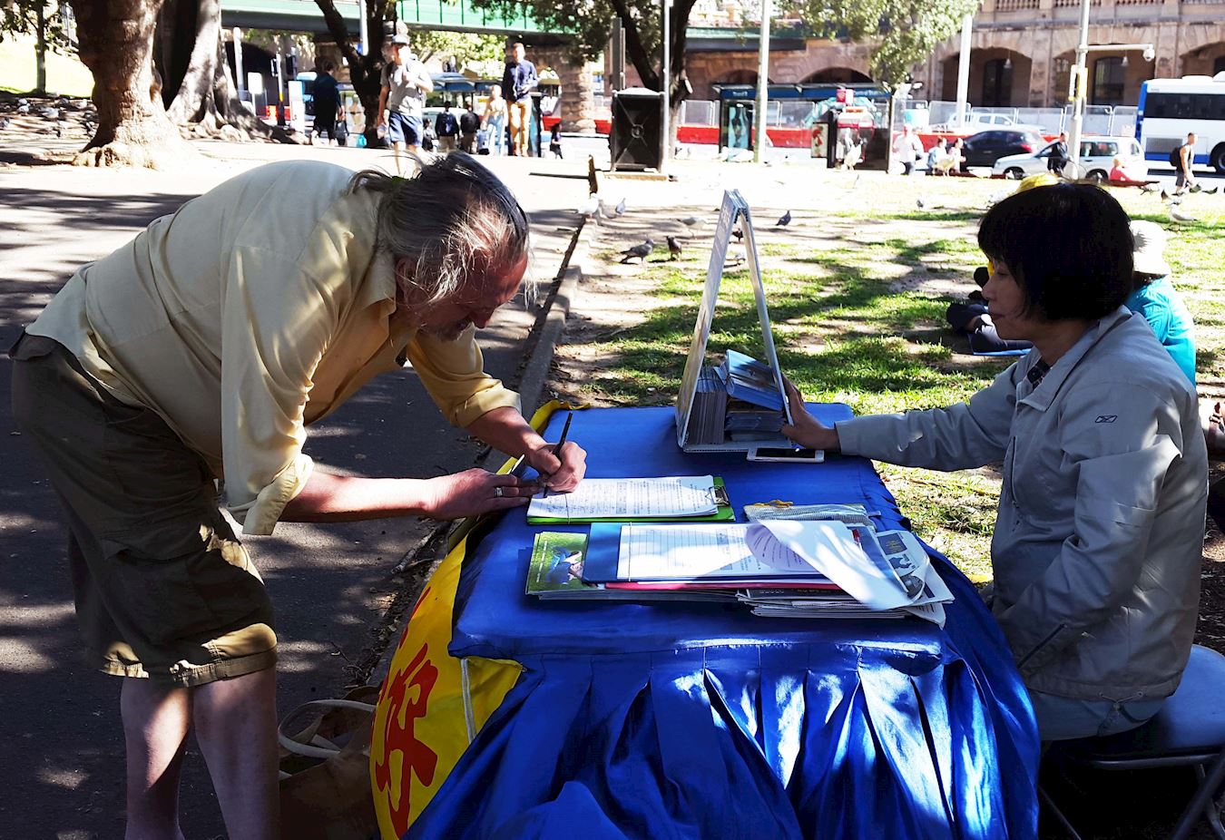 澳洲退役军人杰姆(Jem S)径直走到征签桌前,签名后感慨地表示:“我们需要做的是呼吁更多的澳洲人来关注人权,来帮助制止中共对法轮功的迫害。这个法轮功团体让我尊重和敬佩,因为他们是那么的祥和、善良和自律,不像其他抗议团体。法轮功在社会上展示的总是那么祥和优美的中华文化传统修炼方法。”