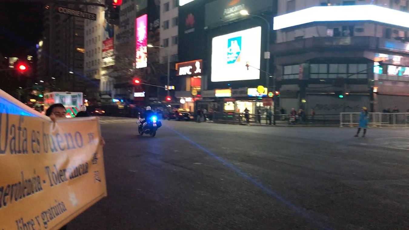 十一月二十九日,在习近平抵达的当天,其车队经过9 de Julio Avenue大道进入布宜诺斯艾利斯市时,看到了法轮功学员打出的一条五米长、上面写着“法轮大法好 真、善、忍好”的黄色横幅。在另外一处,另一组学员在距离习的车队大约一米远的地方展示了“法轮大法”和“制止中共迫害法轮功”两条横幅。尽管此处有些警察一开始被身着红衣的华人催促去阻挡学员举横幅,把学员们拉走;可是习的车队经过后,这些警员在听完真相后非常感动,向学员道歉他们曾试图阻止他们打横幅。