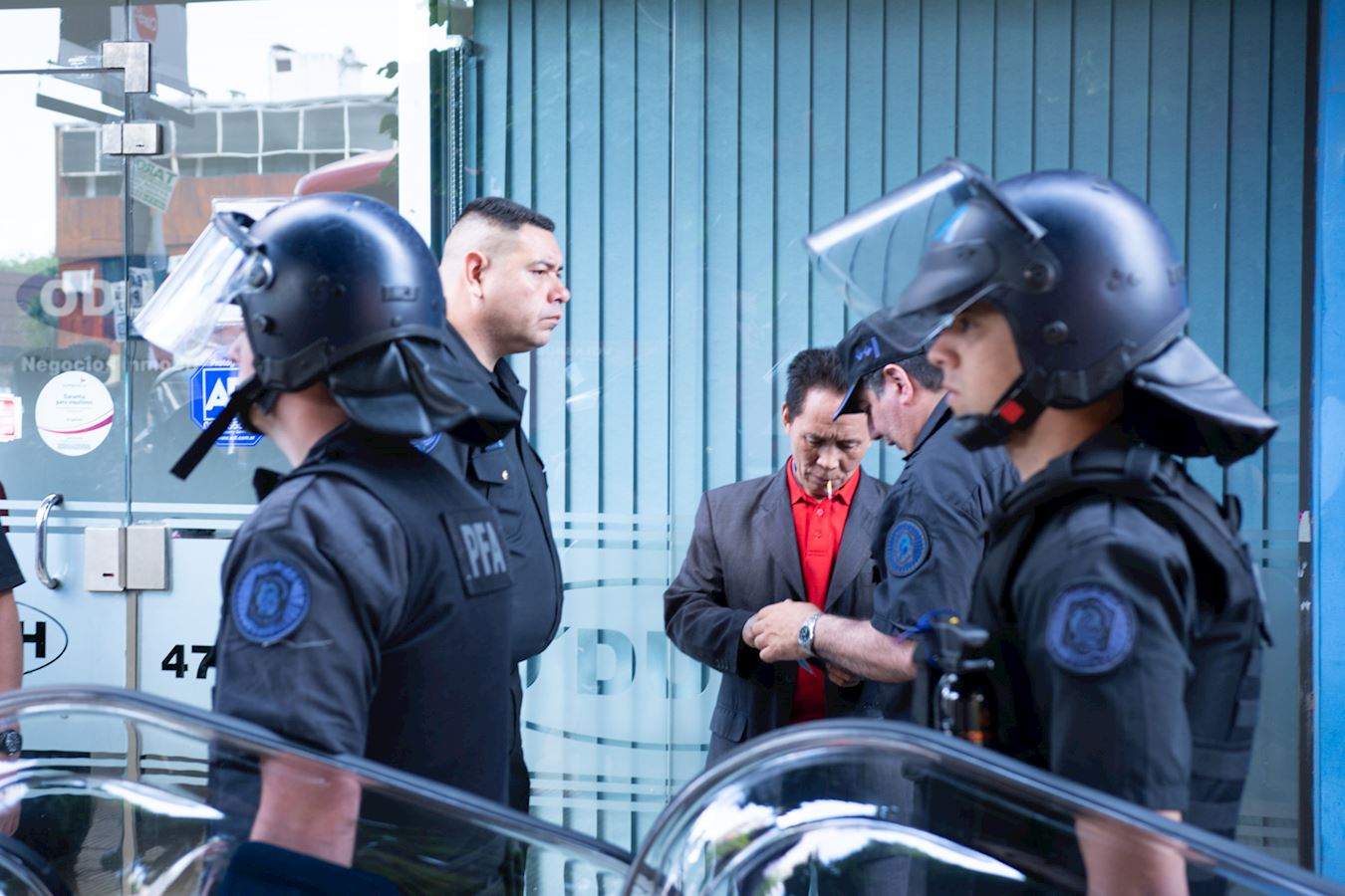 在此次习近平访问期间,当地学员还认出一个曾在二零零四年罗干来阿根廷时,中共雇用的、殴打和平抗议罗干的法轮功学员、后被阿根廷法院下了通缉令的暴徒(一名福建移民)。一位学员手机中存有法院关于他的公告,立即告诉在场的警长,要求逮捕这个暴徒。当时载着该人的中使馆的车已开走了,警车立刻追上,命令中使馆的车队停下,并把那个福建移民带下车,把他带到警局。