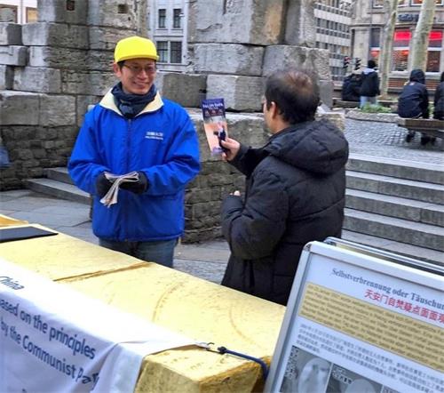 活动当天气象局对科隆及周边地区发布了风暴警报。学员们传真相的活动是在下午和晚上进行的。当时科隆周边地区一直在下大雨,可是大教堂附近只是断断续续下了小雨。再加上著名的科隆圣诞市场就在教堂广场的另一侧,所以活动期间广场上的人还是很多。虽然天很冷,仍有许多民众在风雨中听学员们讲真相。一位中年男子说“脚都冻木了”,但他仍跟学员交谈了十几分钟。