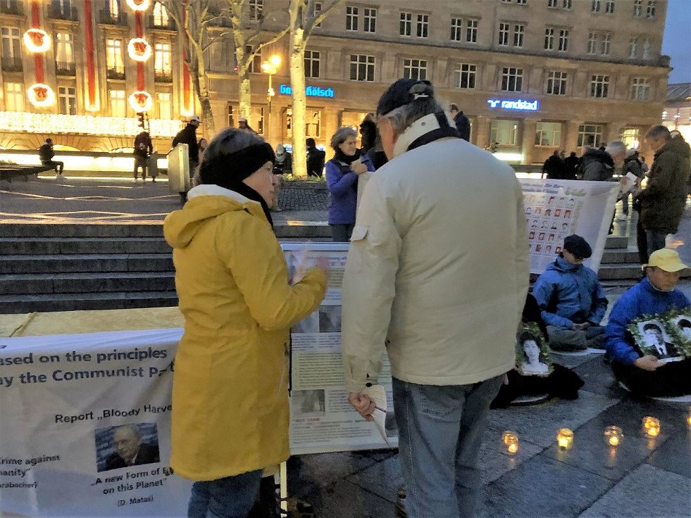 【明慧网二零一八年十二月十日】十二月十日是世界人权日。德国科隆地区的法轮功学员在二零一八年十二月八日这天来到科隆大教堂前,向民众说明什么是法轮功及中共对法轮功的迫害,并为制止迫害征集签名。傍晚时分,学员们开始烛光守夜。活动引起了很多民众的关注,许多人冒着风雨听学员们的讲解,并签名支持反迫害。
