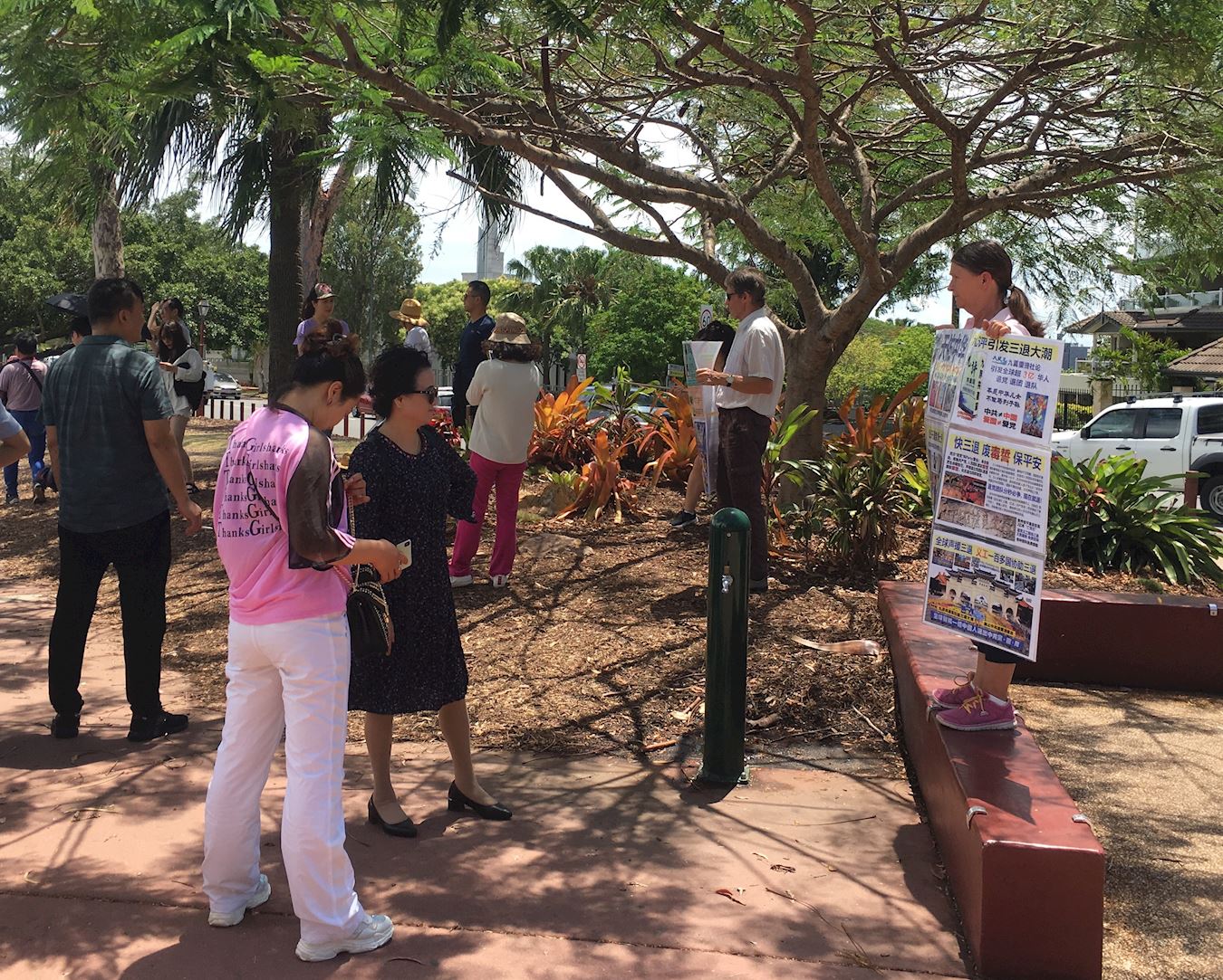 在布里斯本市区的旅游景点袋鼠角,总有定点停留的大巴,供游客欣赏风景,拍照留念。近期,几乎每天中午都能看到约翰和阿曼达手持中文法轮功真相展板,播放真相录音。他们微笑着迎接从车上下来的中国游客,并向他们及导游表示问候。