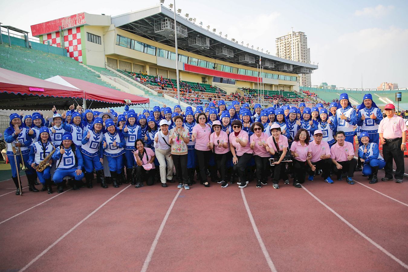 ![]() 图2:台湾志愿服务国际交流协会理事长许惠美女士(中间拿麦克风者)与大会工作人员特别到天国乐团前致敬合影,并用大拇指比“赞”。 |