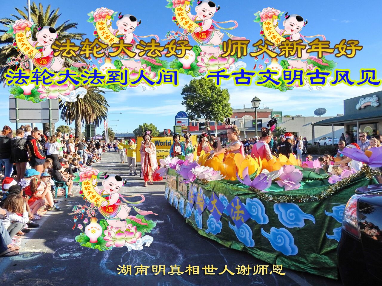 南半球夏日明媚的阳光下,朵朵莲花象征修炼人纯善的心灵,学员们双手合十,表达心声:“墨尔本大法弟子恭祝师尊新年快乐!”