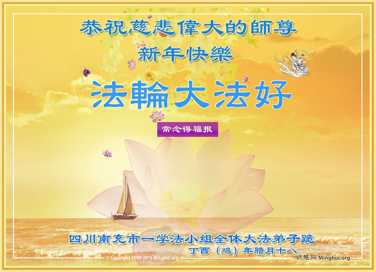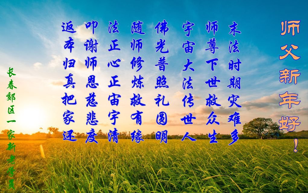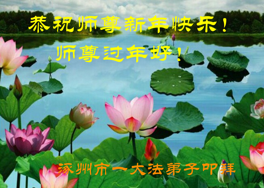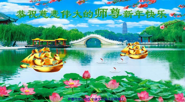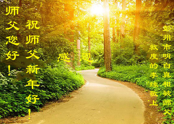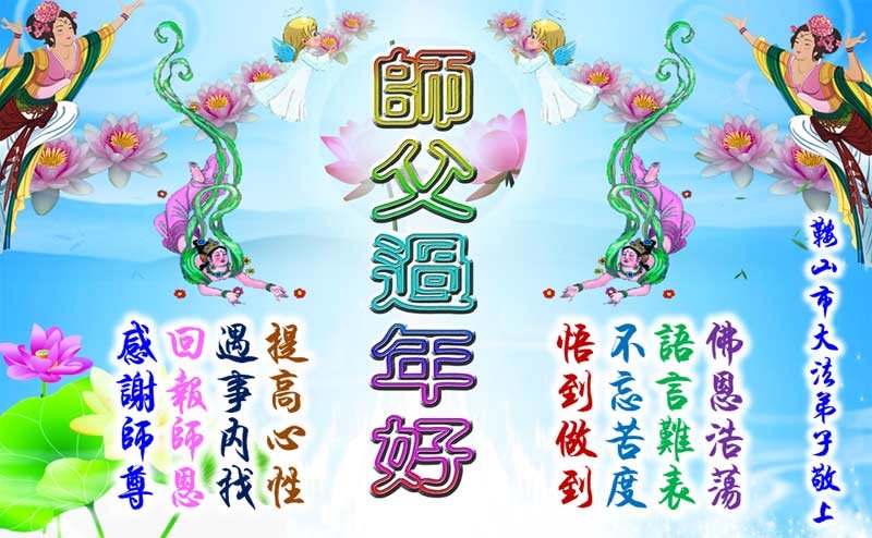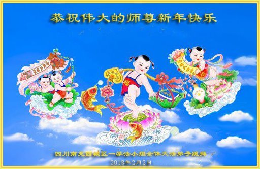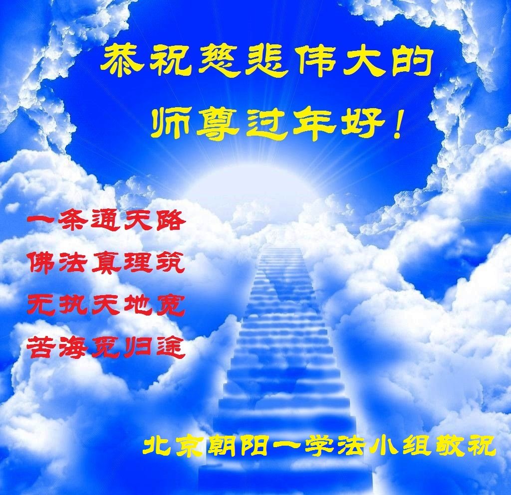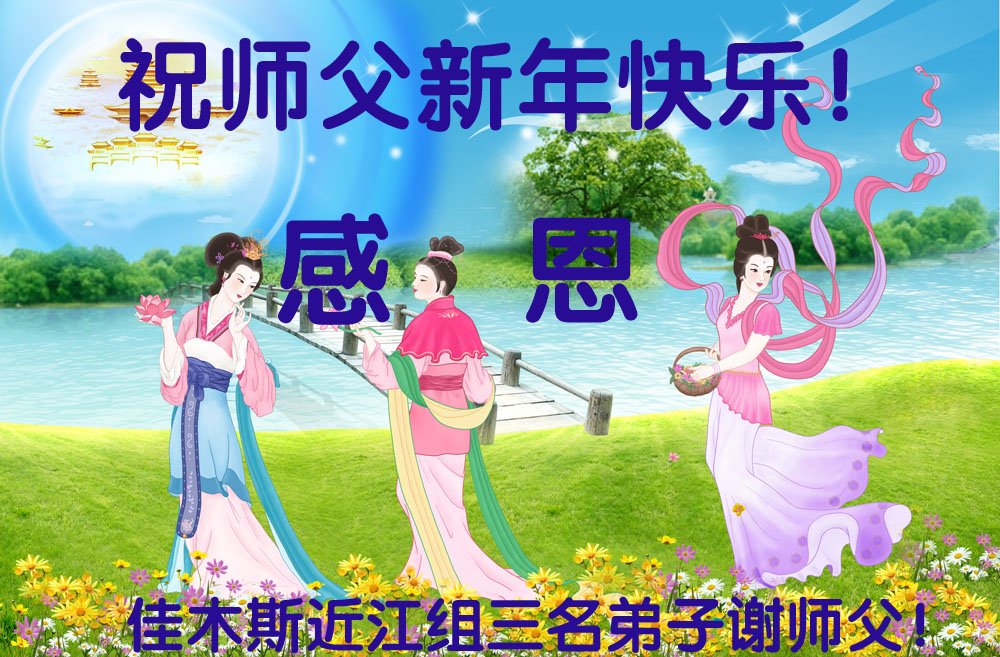 尊敬的师父:您好!在师尊救度苍穹、法正万宇的伟大正法中,新的一年来临了。值此辞旧迎新之际,法国大法弟子在无限感恩中向慈悲伟大的师父拜年!恭祝师父新年快乐!法国大法弟子合十敬拜!