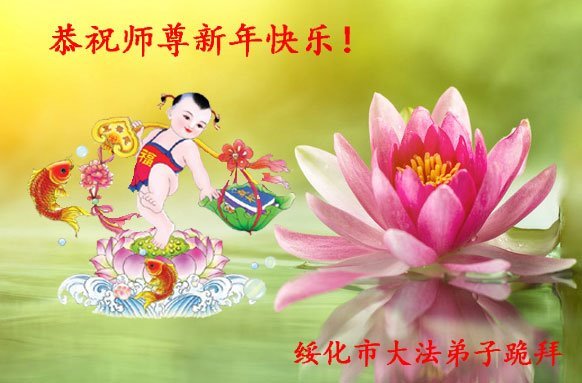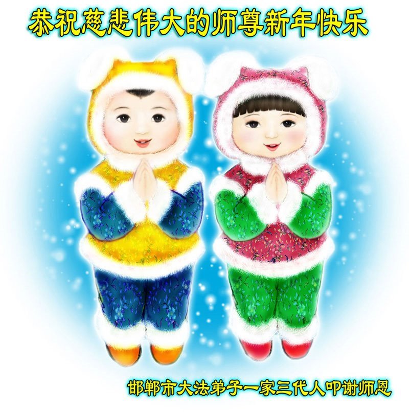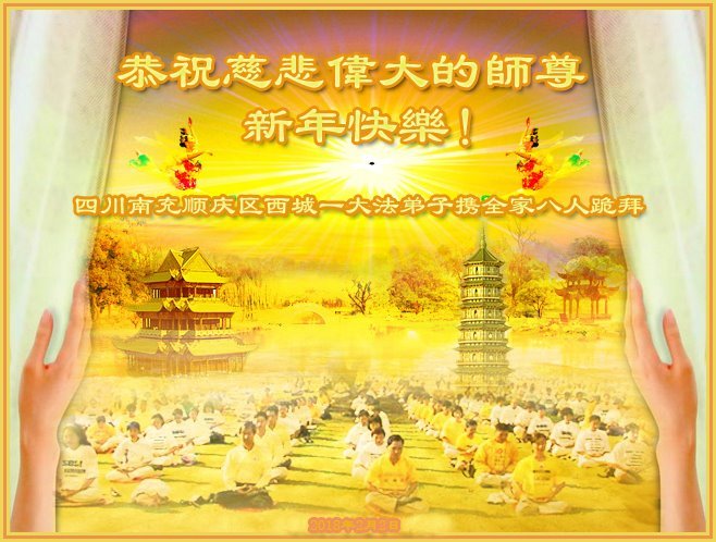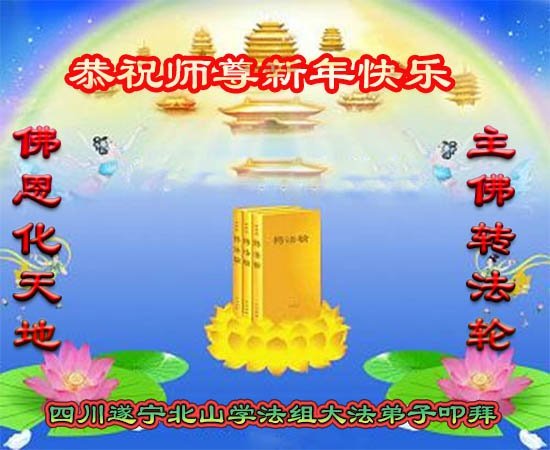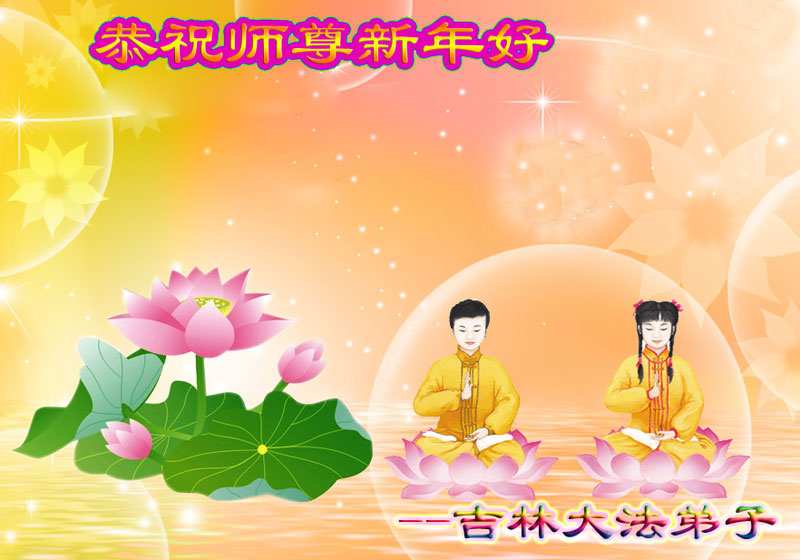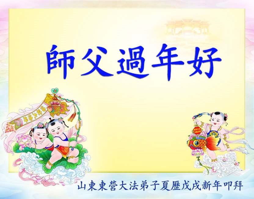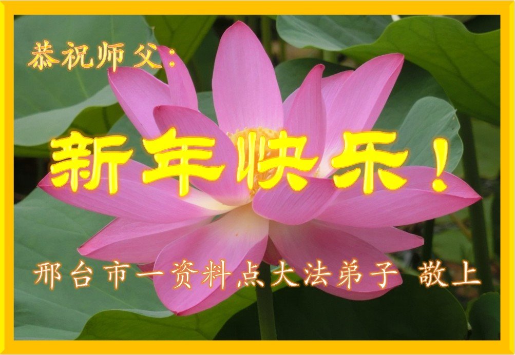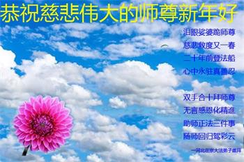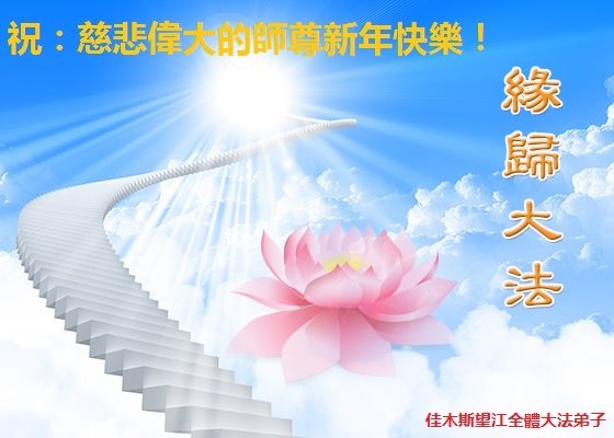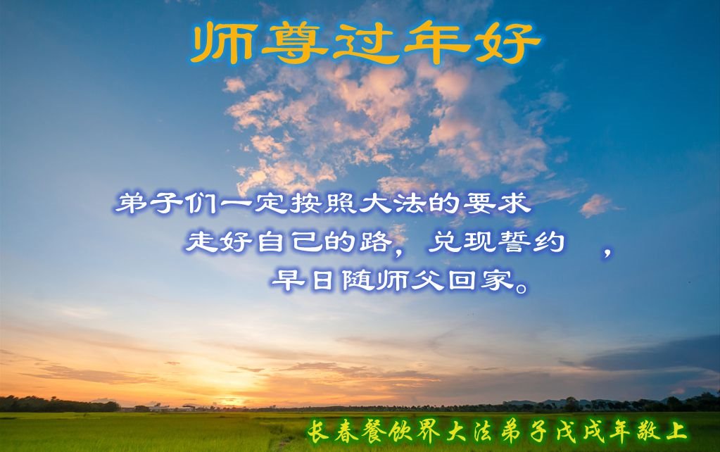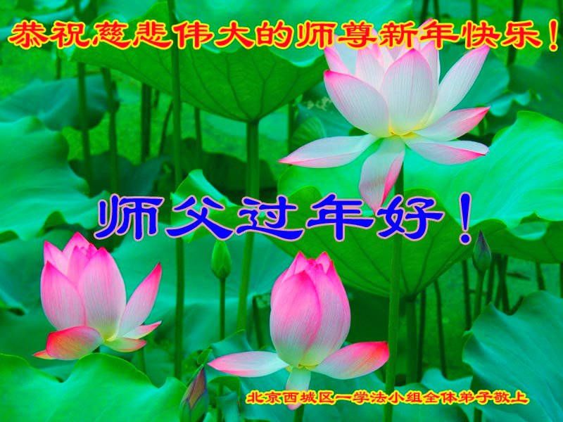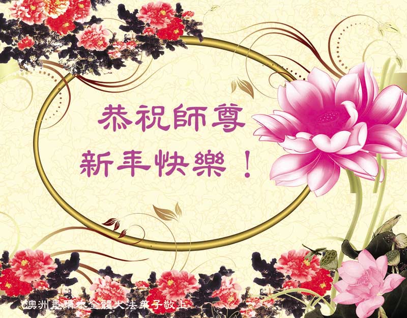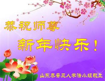 尊敬的师父:您好!在师尊救度苍穹、法正万宇的伟大正法中,新的一年来临了。值此辞旧迎新之际,法国大法弟子在无限感恩中向慈悲伟大的师父拜年!恭祝师父新年快乐!法国大法弟子合十敬拜!