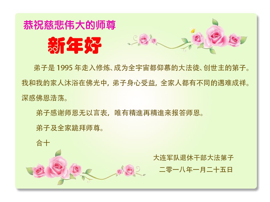 <英文版: http://en.minghui.org/html/articles/2018/2/15/168204.html>政府部门、公检法司、军人大法弟子给师尊拜年