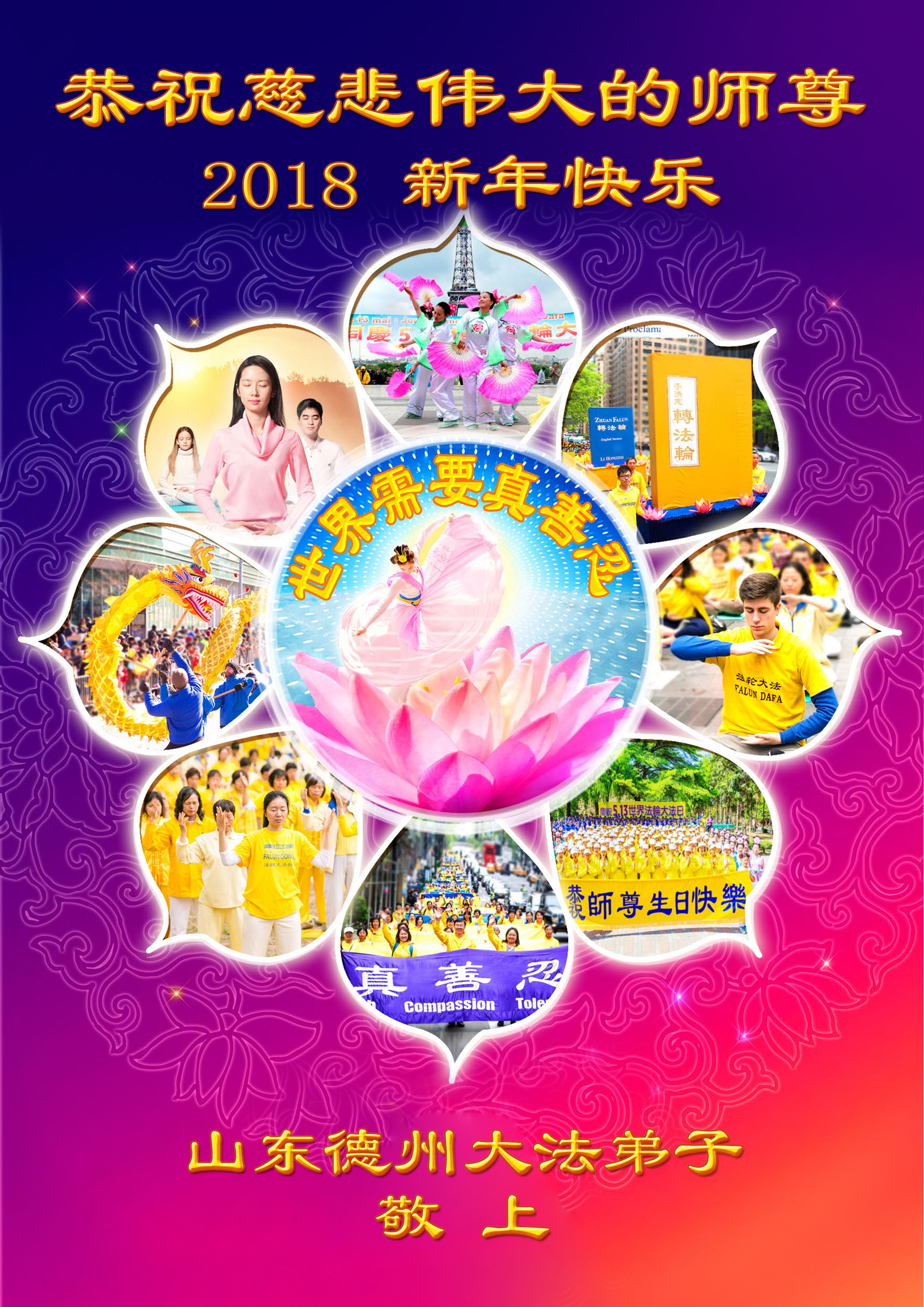 【明慧网二零一八年二月十四日】“宙宇穹苍辞旧颜,人间迈步入新年。师尊普度承千苦,浩荡慈悲语难言。”在二零一八年传统新年来临之际,美国、加拿大、英国、德国、法国、西班牙、俄罗斯、澳大利亚、丹麦、荷兰、瑞典、挪威、克罗地亚、奥地利、瑞士、波兰、芬兰、新西兰、爱尔兰、日本、韩国、越南、马来西亚、泰国、罗马尼亚、保加利亚、捷克、斯洛伐克等二十八个国家多个城市和州县的大法弟子向慈悲伟大的师尊恭祝新年好!感恩师父的浩荡佛恩!