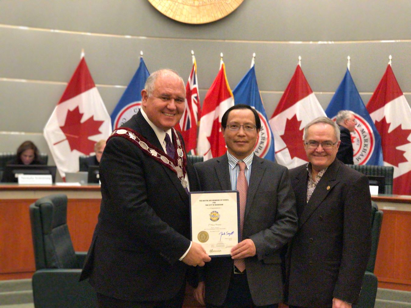 ![]() 图1:二零一八年二月十三日晚七点,加拿大万锦市市长Frank Scarpitti(左)在市议政厅向参加二零一七年圣诞游行的获奖团体颁发奖状,多伦多天国乐团获乐团类别二等奖,多伦多天国乐团团长江帆(中)领奖。 |