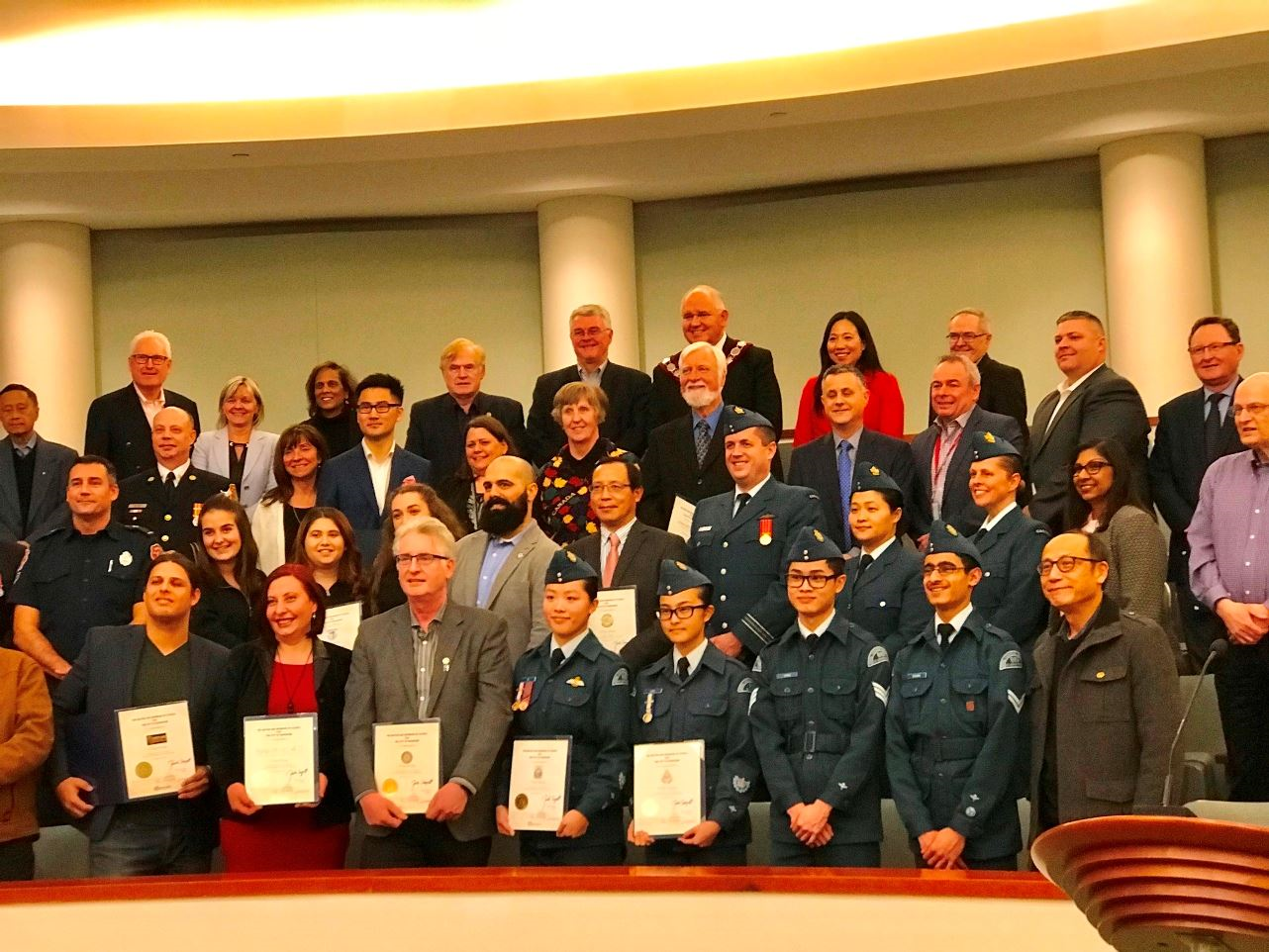 ![]() 图2:万锦市议会市长和全体议员与所有获奖团体合影。第二排左六是天国乐团团长江帆。 |