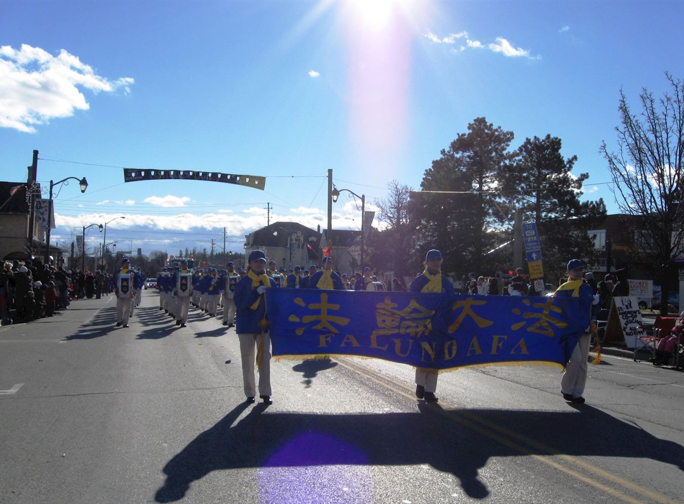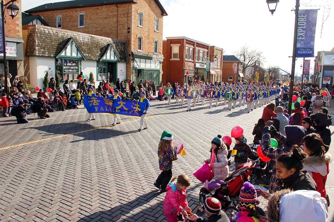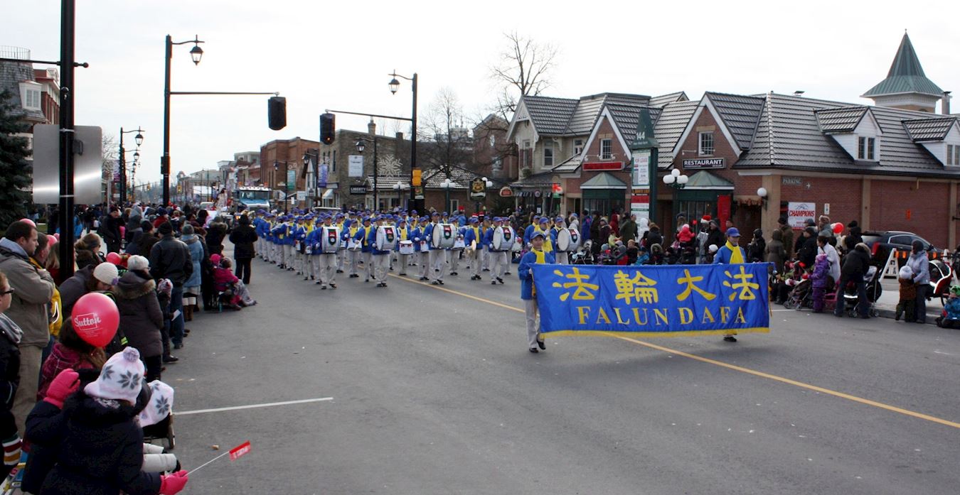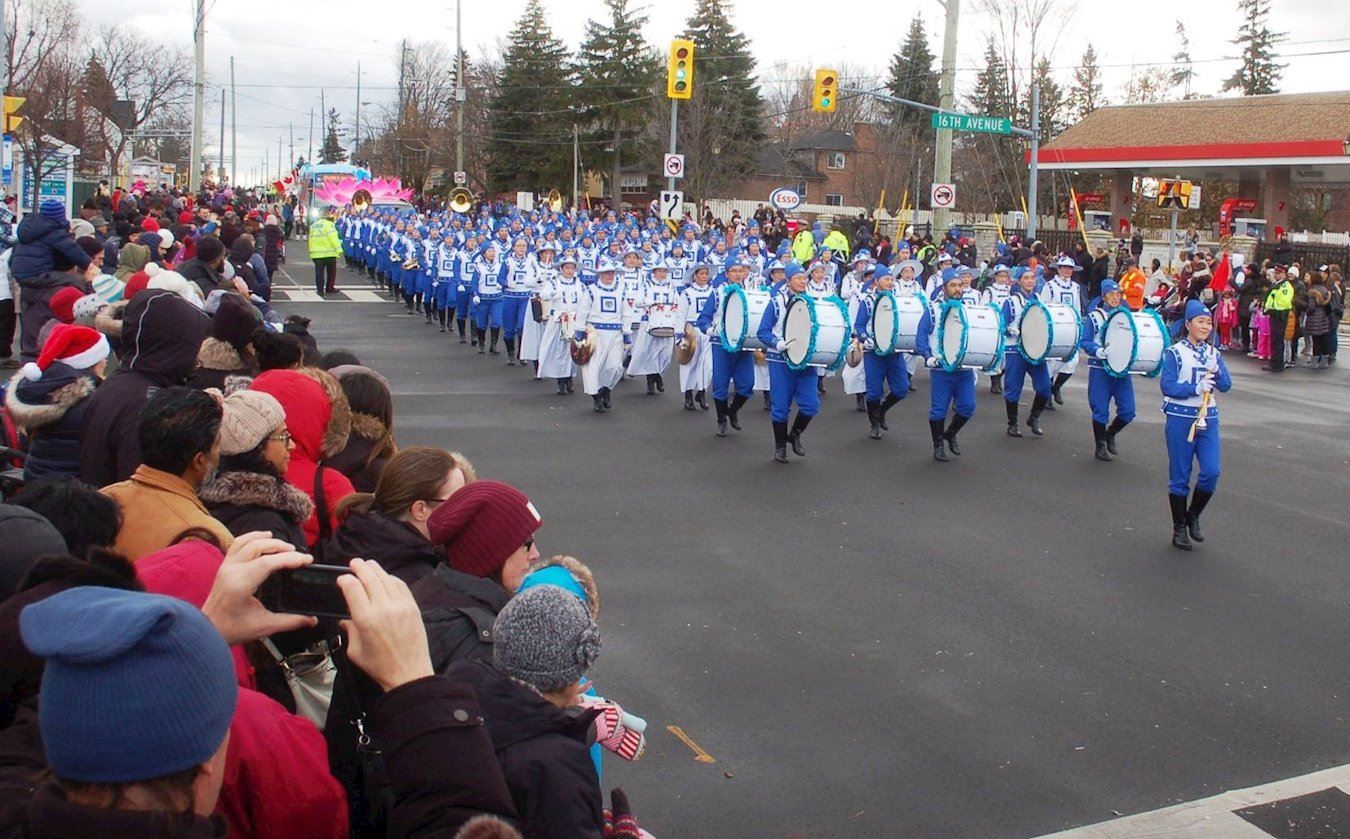 由超过一百八十名法轮功学员组成的多伦多天国乐团于二零零六年四月成立,近十二年来走遍了社区各大小城市,每年的圣诞游行天国乐团都会收到临近很多城市的邀请,其中之一的就是万锦市。天国乐团每次都尽力参加。