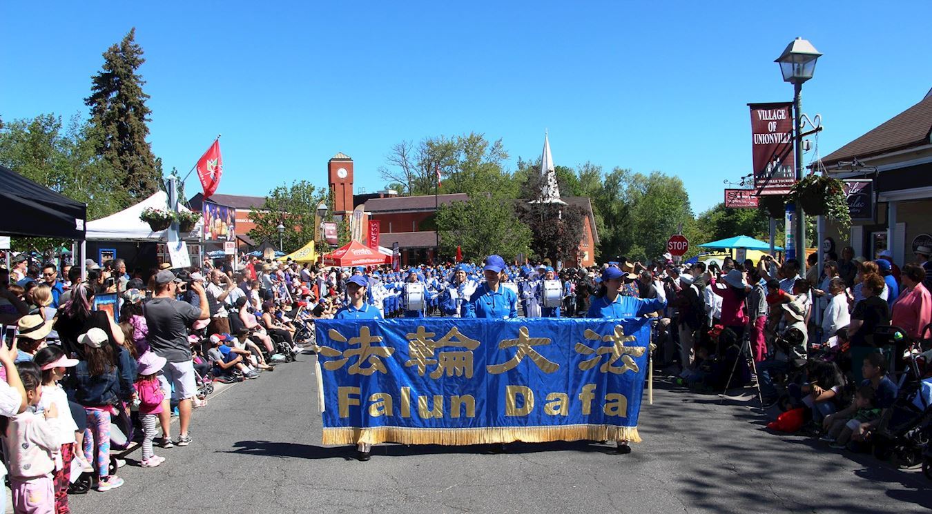 二零一七年六月三日,天国乐团应邀参加了在多伦多邻近的万锦市举行的四十八届伊人村嘉年华节日游行(Unionville Festival parade),这次游行的负责人南希(Nancy)说:“我们今年能邀请到法轮功团体的天国乐团和腰鼓队两个团队来参加我们的游行,真的太高兴、太幸运了。他们在各社区都很有名,他们非常受欢迎,他们给这个城市带来了光明(They bring the bright to this city)。”