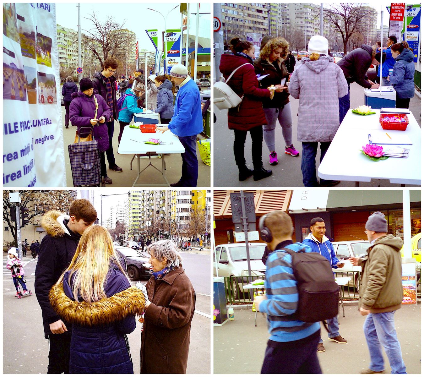 一部份学员在祥和的炼功音乐中展示法轮功功法,一部份学员派发介绍法轮功真相的传单,还有几位学员给过往人群讲述在中国大陆,修炼真善忍的法轮功学员长期被无辜迫害,更有甚者,中共强行活摘法轮功学员的器官进行非法交易牟取暴利。这一残酷的事实令很多罗马尼亚人震惊和愤慨,立即签署了请愿书,反对活摘法轮功学员器官,反对迫害法轮功。