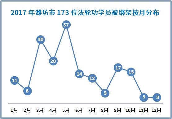 二零一七年,山东省潍坊市法轮功学员173人被绑架。其中,寿光市35人,昌邑市25人,安丘市21人,临朐县16人,青州市13人,诸城市11人,高密市7人,昌乐县7人;潍坊市市值及潍城区、奎文区、寒亭区、坊子区38人。
