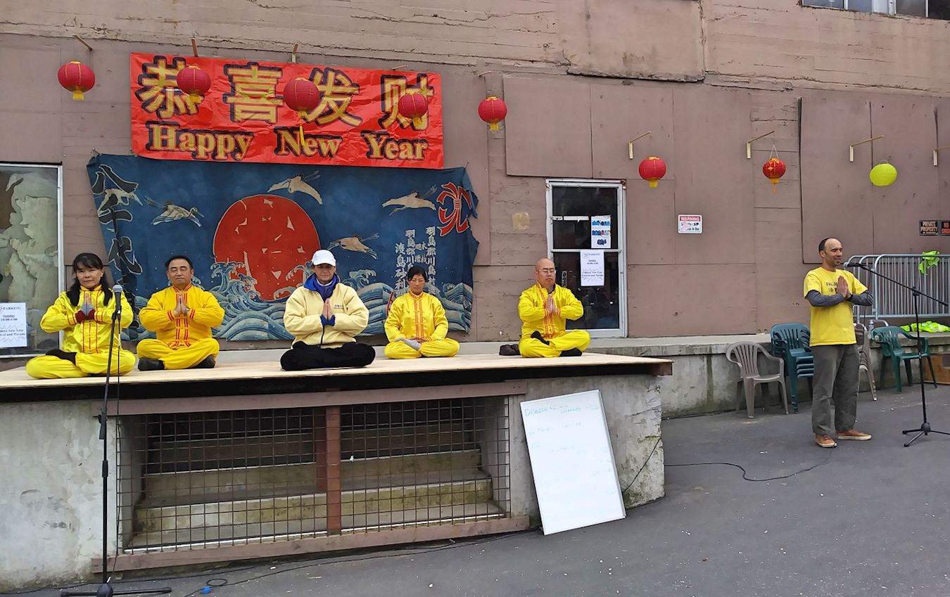 法轮功学员随后表演了唐鼓舞、狮子舞、莲花舞和法轮功五套功法演示。精彩的表演,把过年的喜庆以及修炼人特有的慈悲、优雅传递给了观看的民众。人们在每个表演结束时,都报以热烈的掌声。