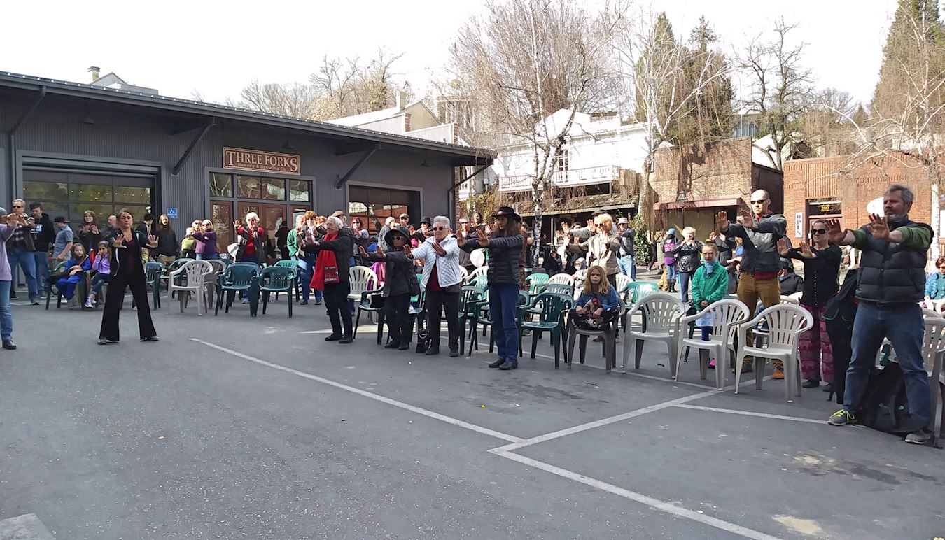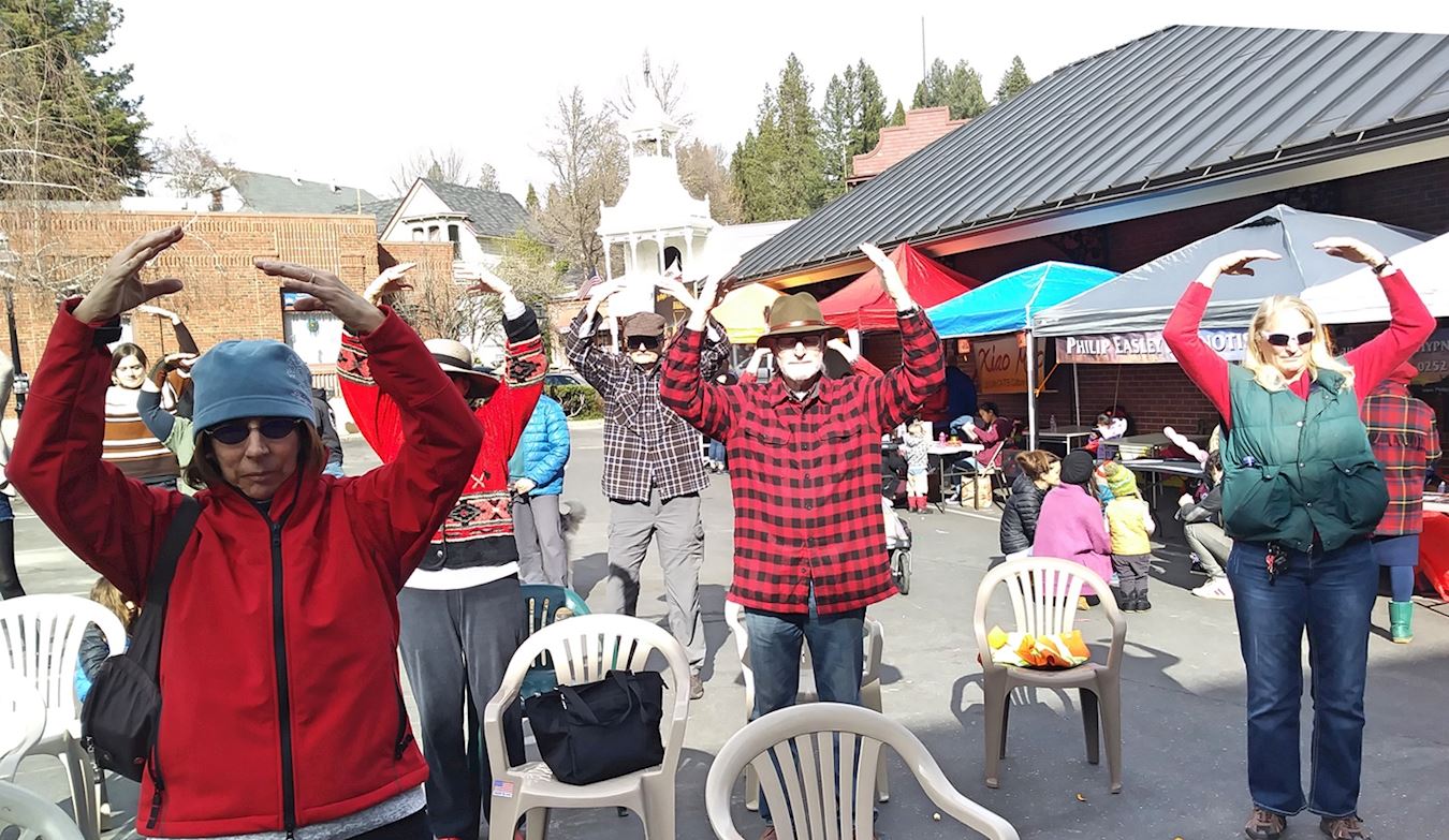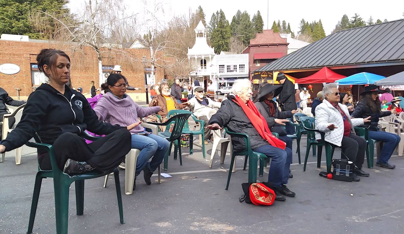 二月二十五日,位于沙加缅度以北约六十英里的内华达城(Nevada City)的市区中心,举办每年一度的“内华达城庆祝中国新年活动”,法轮功学员应邀参加了庆祝游行,并在游行结束后,在舞台上表演功法,台下的观众一边观看一边认真模仿动作。