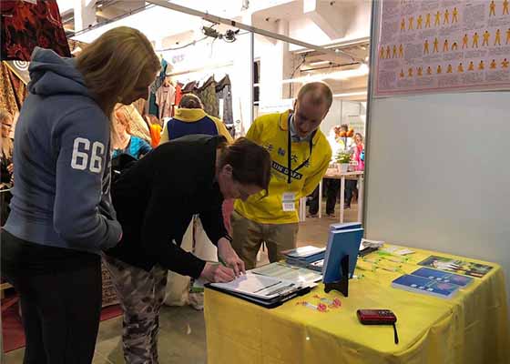 三月三日和四日,芬兰法轮功学员参加了赫尔辛基举办的第六届瑜伽节展会。法轮大法的展位让很多人感兴趣,很多人专门前来签名支持法轮功学员们反迫害。