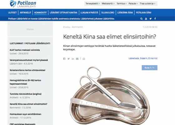 芬兰综合性杂志《患者医学杂志》于三月四日发表了一篇名为《谁从中国接受了器官移植?》的文章。