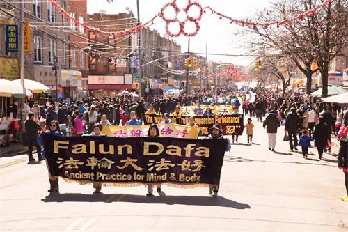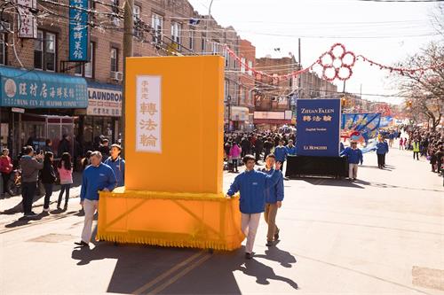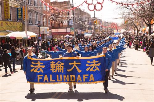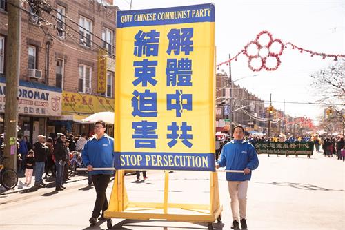 近年来,众多的华人移居于布碌伦,使这里发展成新兴的华人社区,店铺林立,人气很旺。游行当日,正值暴风雪后的放晴,阳光灿烂,蓝天白云下,游行队伍从八大道飞龙超市前面的六十六街启程,由天国乐团打头阵,随后是“法轮大法好”、“停止迫害法轮功”、“祝贺三亿中华儿女退出中共”三大方阵,中间有舞龙舞狮,炼功队,花船队,腰鼓队等众多队伍。八大道上从六十六街到四十二街,放眼望去,旌旗林立,鼓乐齐鸣,龙腾狮舞。