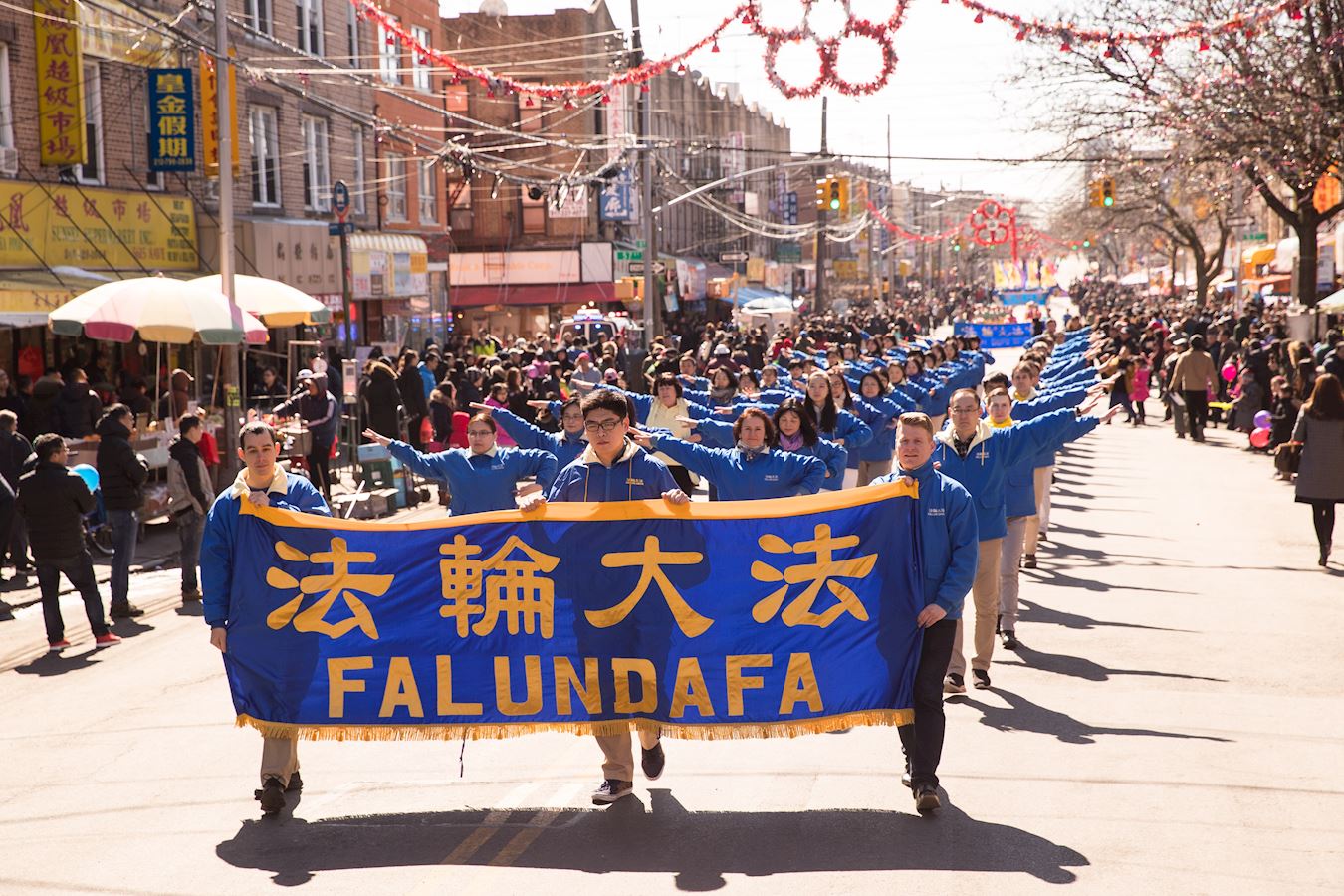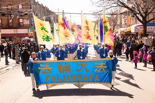 【明慧网二零一八年三月十四日】(明慧记者采菊纽约综合报道)二零一八年三月十一日(星期日),近千名法轮功学员来到纽约第三大华人社区布碌伦第八大道举行盛大游行,传递“法轮大法好”,“天要灭中共,三退保平安”的天机。