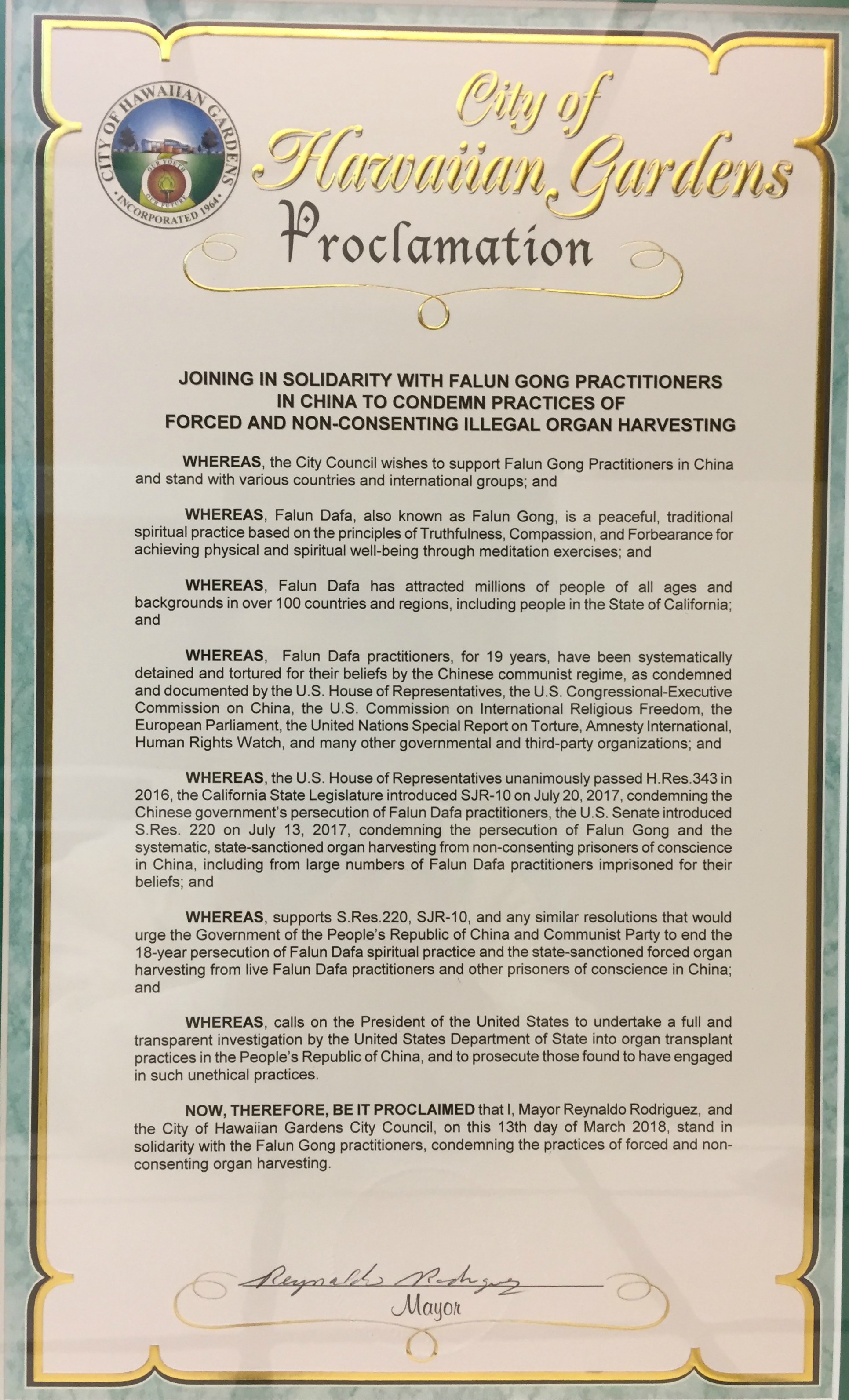 【明慧网二零一八年三月十七日】继美国加州共和党联盟(California Republican Assembly)三月三日通过支持法轮功的反强摘器官决议后,二零一八年三月十三日,洛杉矶县夏威夷花园市(Hawaiian Gardens)市议会也全体通过了支持法轮功、谴责中共强摘器官罪行的宣言。