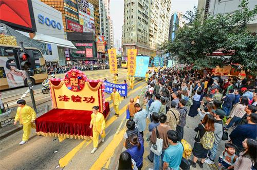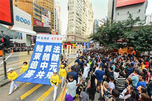 约七百人的游行队伍下午二时从北角英皇道游乐场出发,沿着港岛区主要街道前往终点西环中联办,途经铜锣湾、湾仔、中环多个购物热点。游行由天国乐团领头,有“三亿三退 普世同庆”、“法轮大法洪传世界”、“和平理性反迫害”、“天灭中共 三退是福”等六大方阵,并有腰鼓队、旗鼓队等表演,吸引许多香港市民和大陆游客驻足观看,他们纷纷以手机拍下游行的场面。