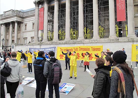 二零一八年三月二十四日,英国法轮功学员在伦敦特拉法加广场(鸽子广场)开展讲真相活动,庆祝三亿中国人退出中共党、团、队组织,向来自世界各地的游客传播法轮大法的美好。