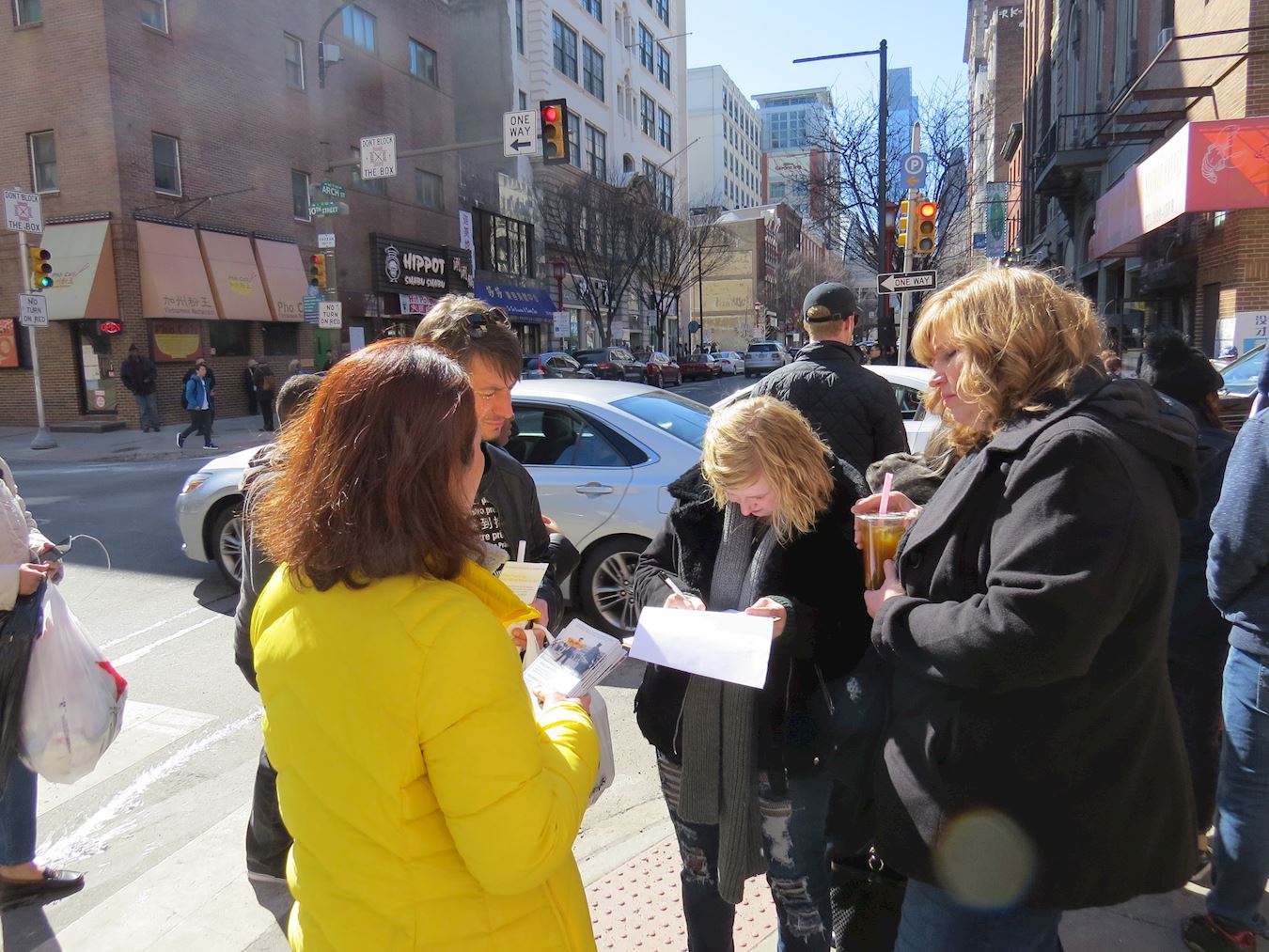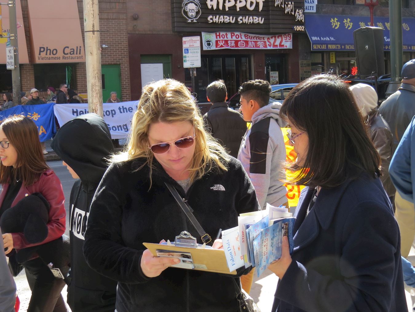 ![]() 图1:二零一八年三月二十四日,大费城地区部份法轮功学员在费城中国城举办集会,庆贺三亿中国人退出中共的党团队组织,并向路人介绍法轮功的美好 |