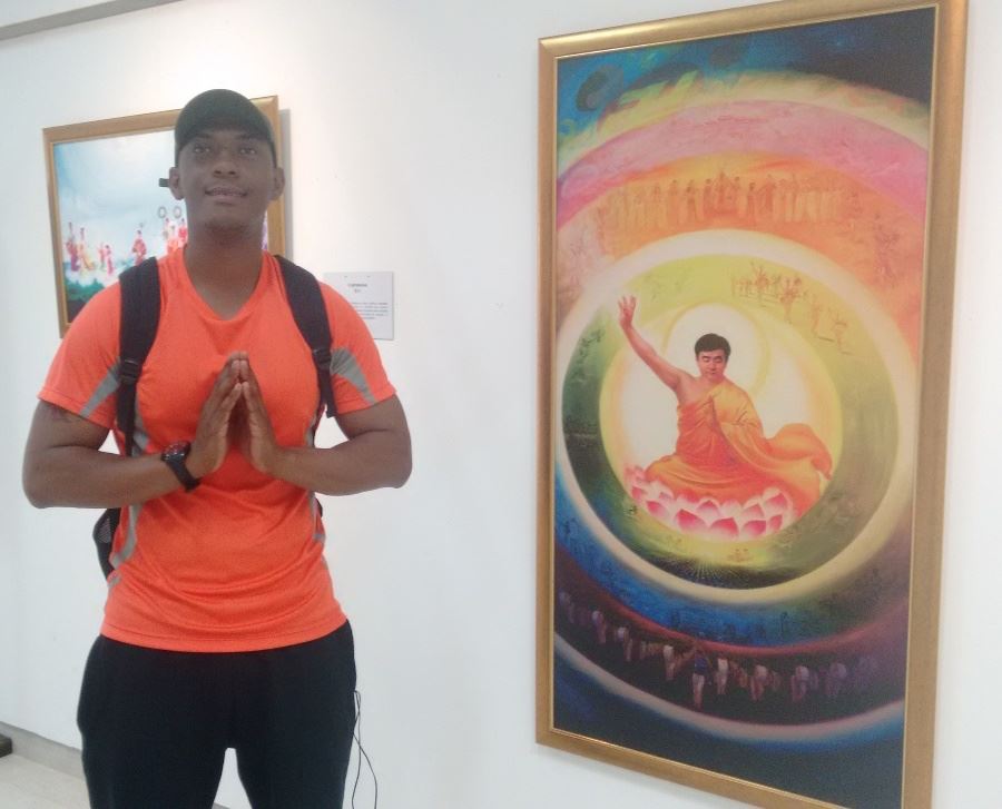一个小伙子Jeremias 自称是个无神论者,通过画展的观看,他的思想在转变,表示要上网去看书,要重新建立新思维。他在他最喜欢的《运乾坤》前合十留影。