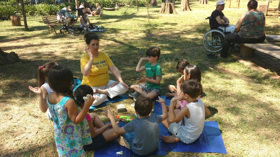 圣保罗市的Severo Gomes公园炼功点上一群儿童认真的学习打坐。一个小姑娘说:“太难以相信,我会坐下来不短的时间,因为以前我不会有片刻的时间安静下来。”一个小男孩问道:“打坐时会感受到能量吗?因为我全身都有很强的能量通过的感觉。”他们的父母也都从自己孩子身上看到了法轮大法的美好。