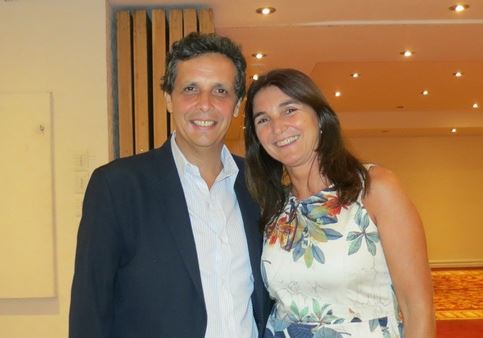 Manoel 和 Rosangela 夫妇俩是乡村音乐二重唱表演者,来参加达人赛,赛后他俩观看了画作,非常欣喜,并在《法轮图》前留影,当学员告诉他们法轮的含义时,妻子兴奋地大声说:“我们选择的对了!”