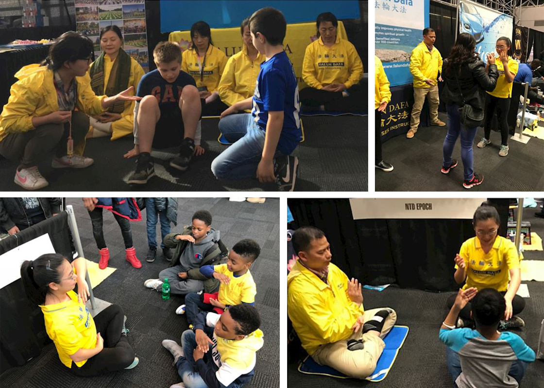 每天从早上十点到晚上十点,法轮功学员的展位上,五套功法展示在展会中显得格外与众不同,大家都很好奇在这喧闹和充满物质利益气氛的展会中,一群穿黄衣服的人能如此宁静祥和的打坐,惊讶的同时,有的拍照,有的接过传单了解详情,有的索性当场学炼起来。