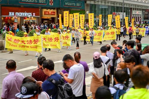 大陆游客孔小姐说:“我觉得这是很庞大的一支队伍,很整齐壮观。香港很开放,可以允许集会。”和孔小姐一起来港购物的周小姐也是第一次看到法轮功游行,“感觉他们很有秩序,很平和。”她表示大陆宣传法轮功自焚,原来是造假的,并认同每个人都应有信仰自由。