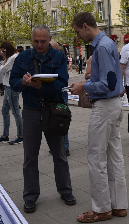 四月十五日, Maszewski先生路过华沙古城,看到长长的法轮功真相展板,不由驻足观看,他越看越感到震惊,随即和法轮功学员做了长时间的询问和交谈。他对法轮功学员说:“你们办这样的活动太重要了,太必要了,也太需要了,你们应该让所有的人都知道这个事实,特别是波兰主管器官移植的各个部门,应该阻止这样的器官进入波兰,也应该阻止波兰人去中国做器官移植,最重要的是要让所有的人都知道中共的罪行。我从来不参加任何形式的征签,但今天破例,我要写下我的名字,有良知的人都要支持你们,支持你们就是支持正义。”