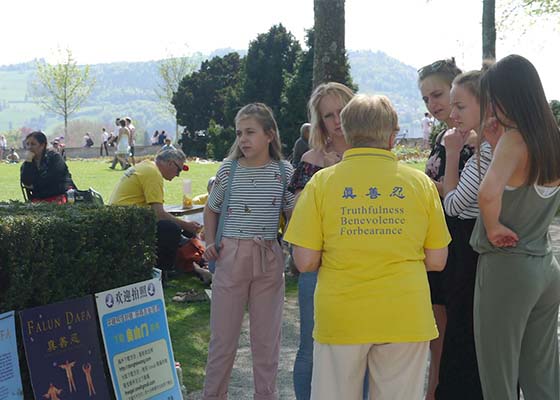 四月二十二日,瑞士法轮功学员来到首都伯尔尼景点——玫瑰花园集体炼功,纪念十九年前万名法轮功学员在北京的和平上访。