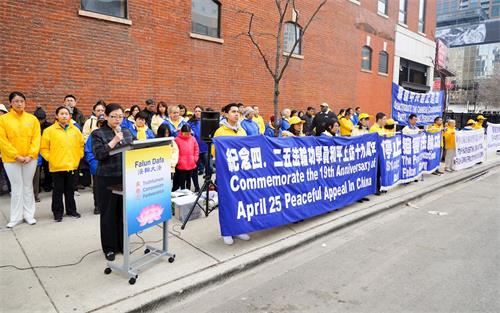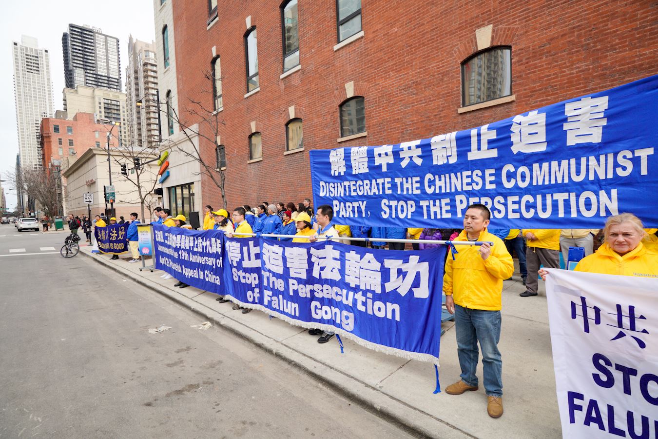 【明慧网二零一八年四月二十四日】二零一八年四月二十一日下午,美国大芝加哥地区的法轮功学员来到中领馆外,纪念“四·二五”和平上访十九周年。十九年前的四月二十五日,万名法轮功学员为了天津被抓被打的法轮功学员进京请愿,呼吁释放天津被抓的学员。