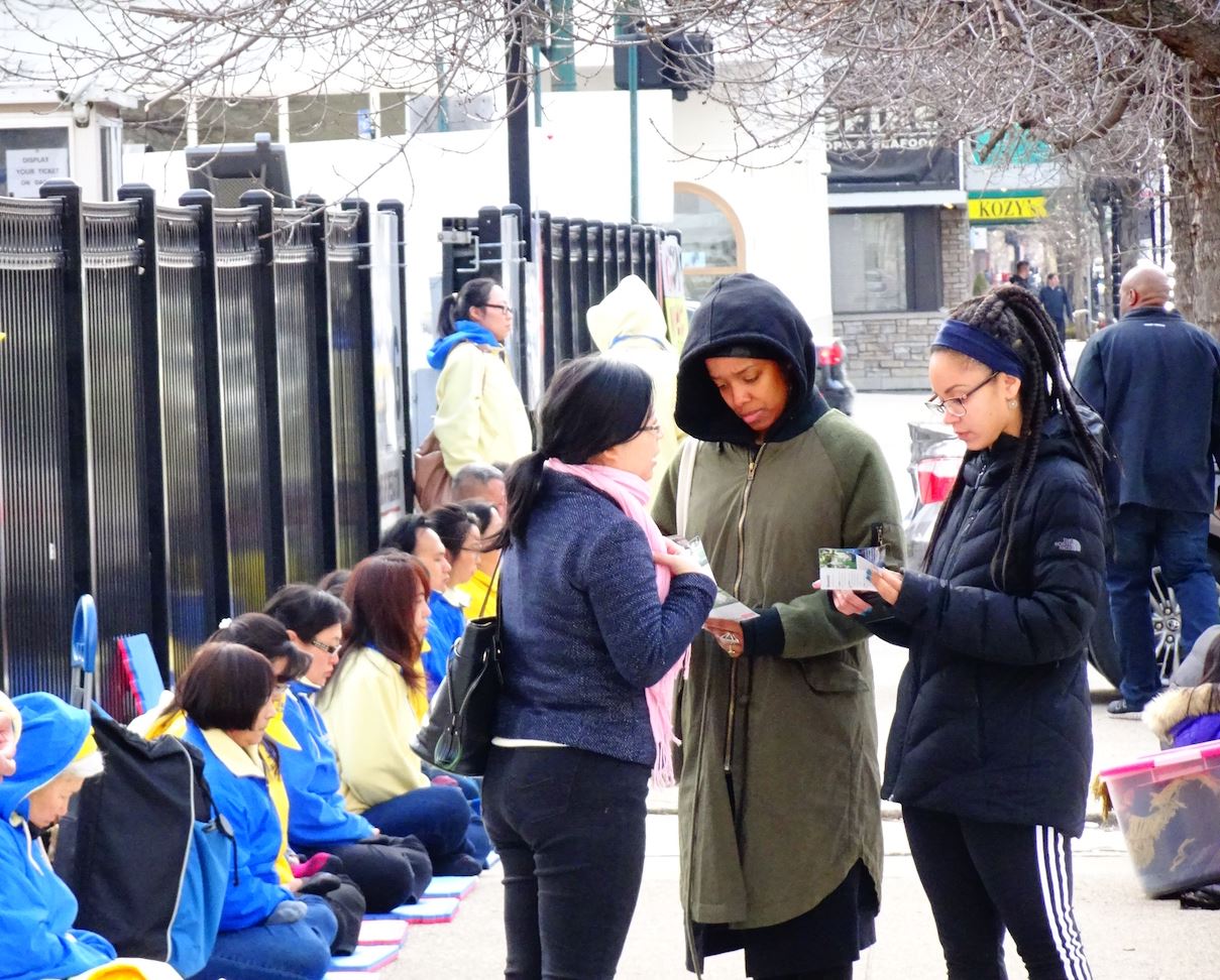 ![]() 图3~4:四月二十一日,芝加哥法轮功学员在中领馆外举办集会,纪念“四二五”十九周年,图为学员向过往民众讲真相。 |