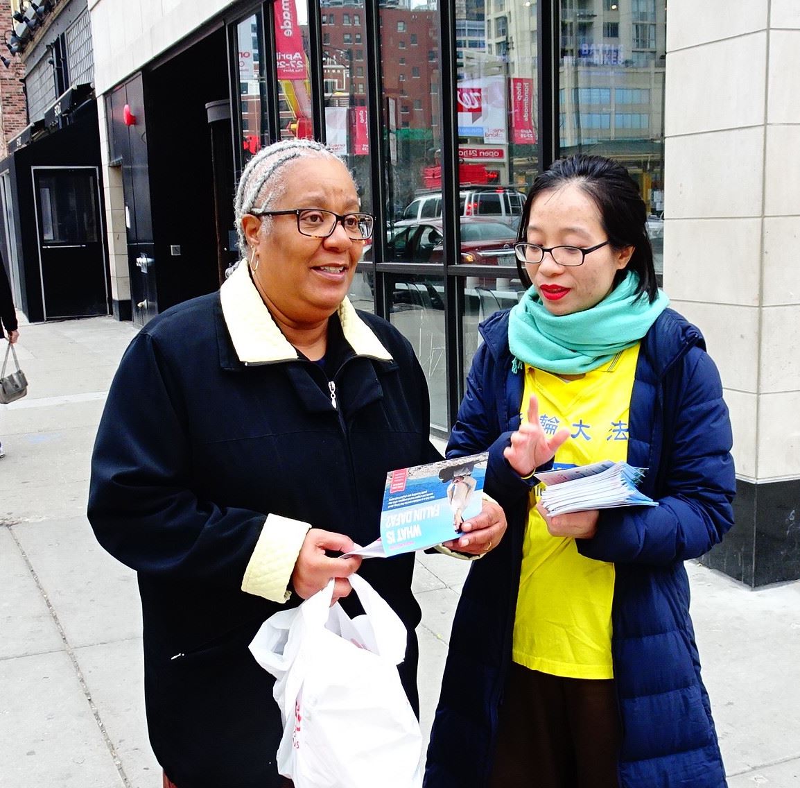 纽约居民莱斯林顿(Leslinton)表达:“每个人都应该有(真、善、忍),是国际价值,非常纯净的价值观,他们(法轮功)是很棒的团体。”