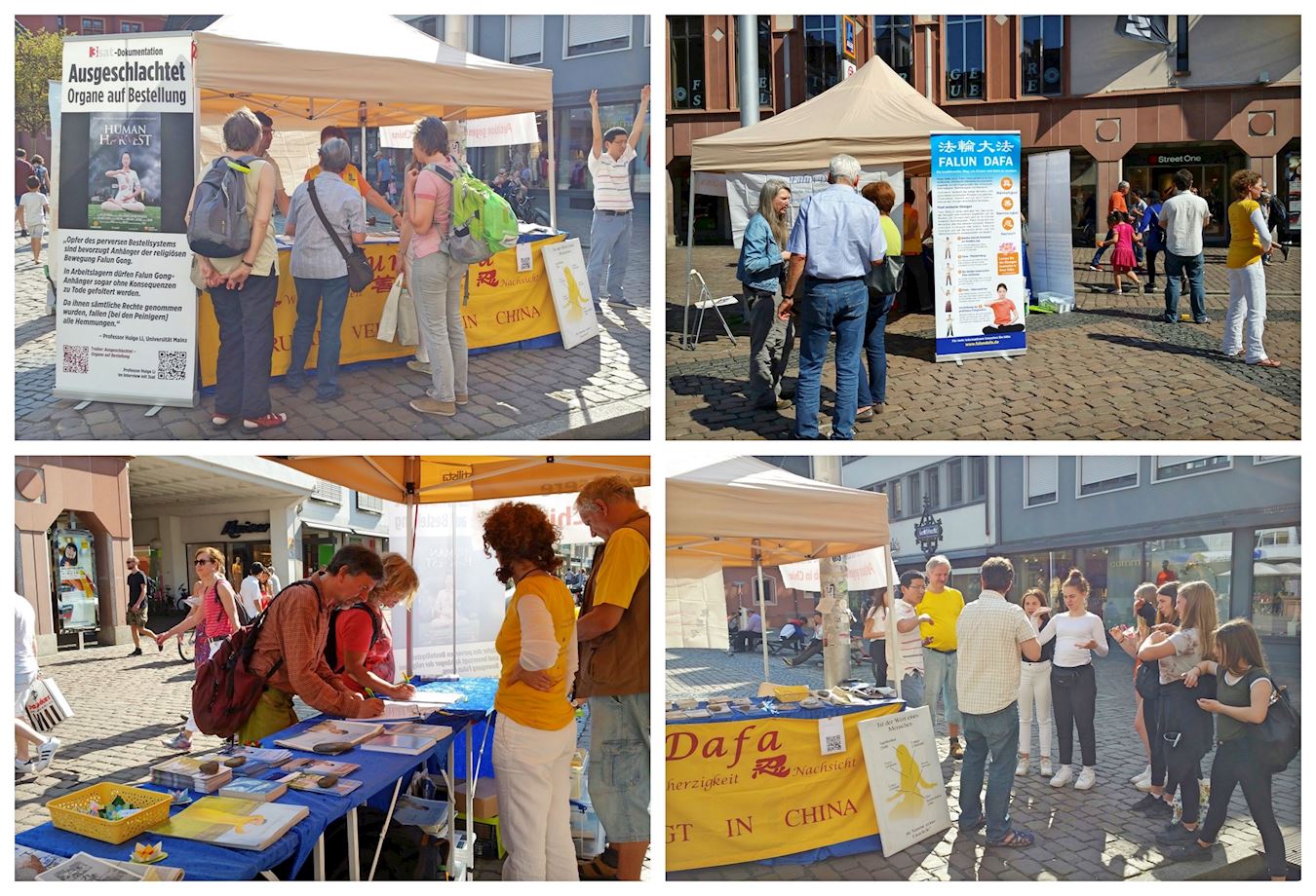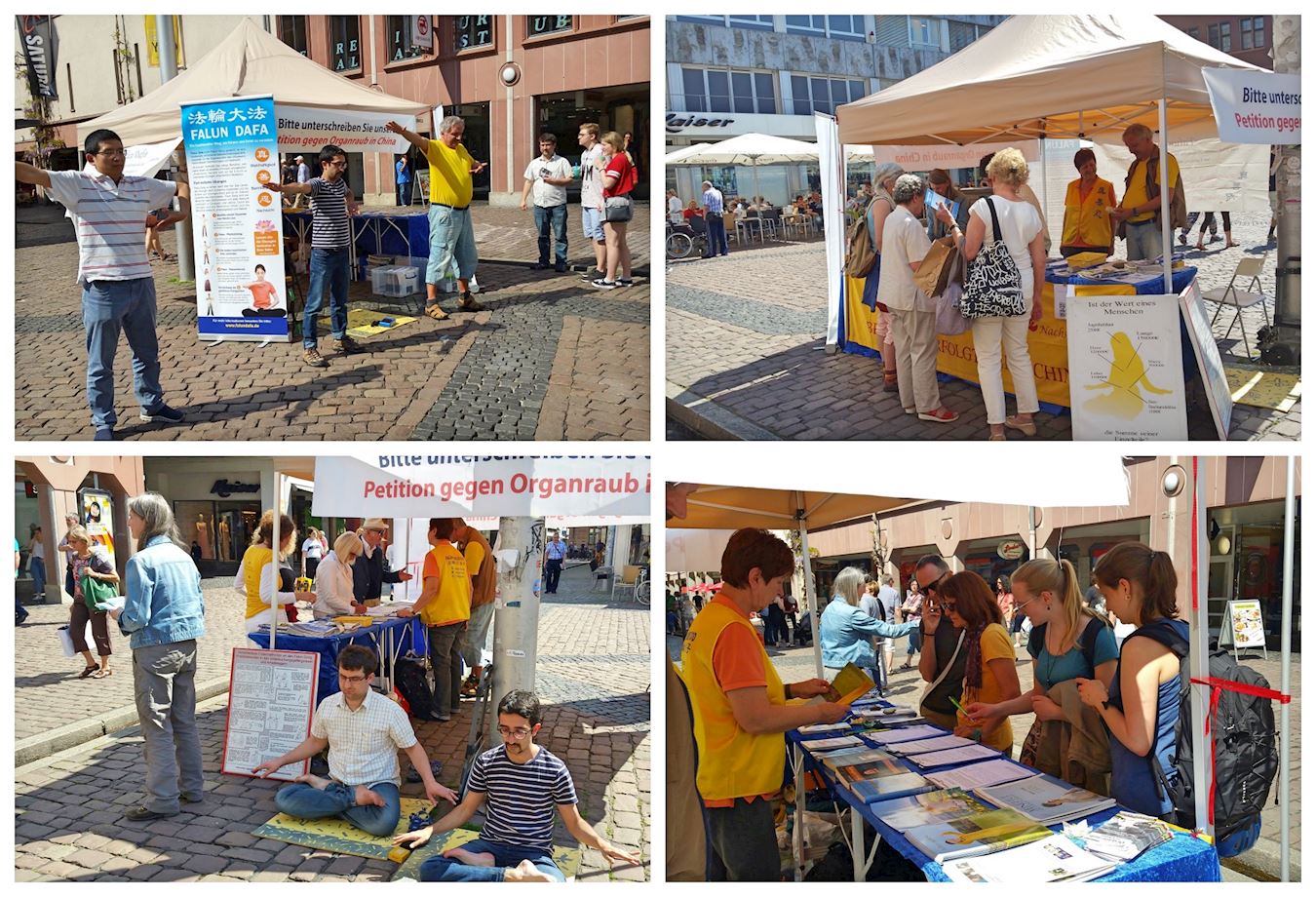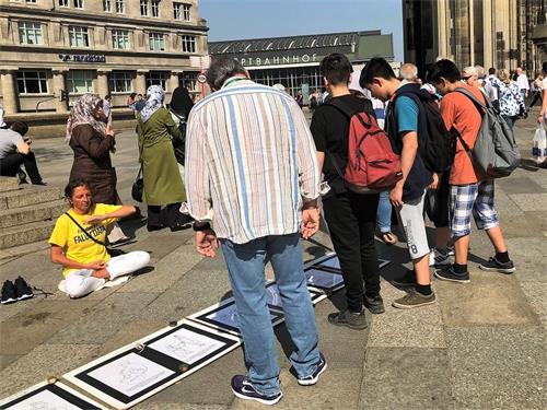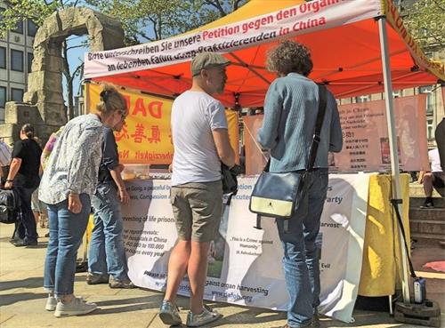 当天的弗莱堡阳光明媚,大街小巷摆满的露天“咖啡吧”引来更多居民、游客逛街购物,市中心商业街显得非常热闹。信息台还没搭建完,就有人过来了解法轮功的真相,索要真相资料,有的签名支持反迫害。不少人在远处看到法轮功遭强摘器官迫害的横幅后,径直走过来要求签名。信息台前走了一拨又来一拨,始终络绎不绝。来人中装束不同,语言、肤色、国籍、职业、信仰等也各不相同,但是,在支持法轮功学员反迫害上,他们是一致的,对中共活摘器官罪行表现出极大震惊和愤慨,对这种大大突破人类道德底线的罪行是“零容忍”。不少人赞赏法轮功学员举办信息日,认为坚持揭露罪恶是最后能制止罪行的有效前提。