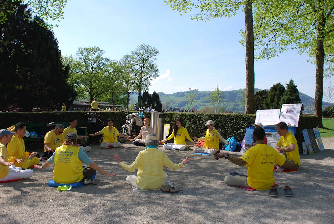 四月二十一,蒙特利尔春光明媚,在平和的音乐声中,法轮功学员集体炼功的场面显得格外祥和、安宁,很多路人驻足观看功法,阅读揭露中共迫害的展板。许多民众在同法轮功学员的交谈中了解真相后,向法轮功学员表达支持。