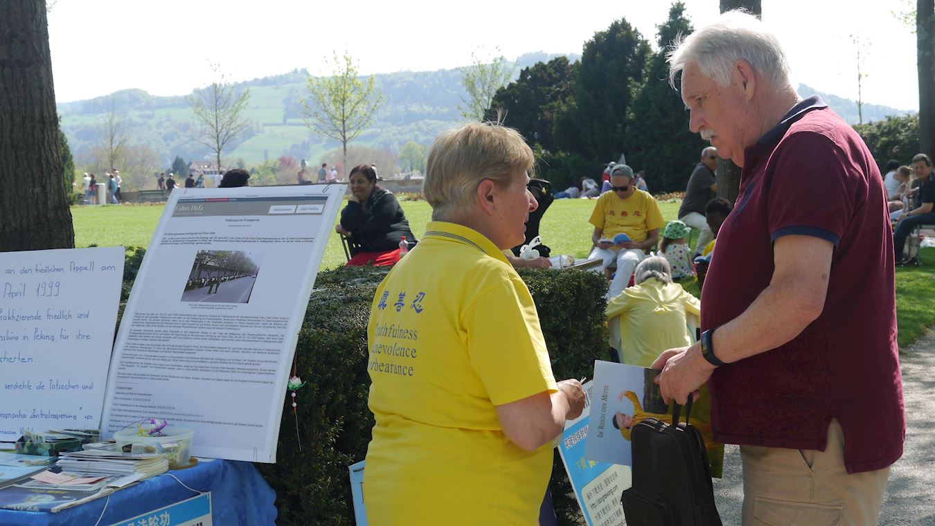 【明慧网二零一八年四月二十四日】二零一八年四月二十一日,黑森林地区的法轮功学员在德国弗莱堡市,举办法轮功信息日,纪念“四·二五”十九周年。当一群大陆游客经过法轮功信息台时,一位五十多岁的先生向前伸直胳膊挑着大拇指说:“法轮功是这个!”之后他又说:“我没你们勇敢,没敢炼。但是我知道法轮功好!真的好!”