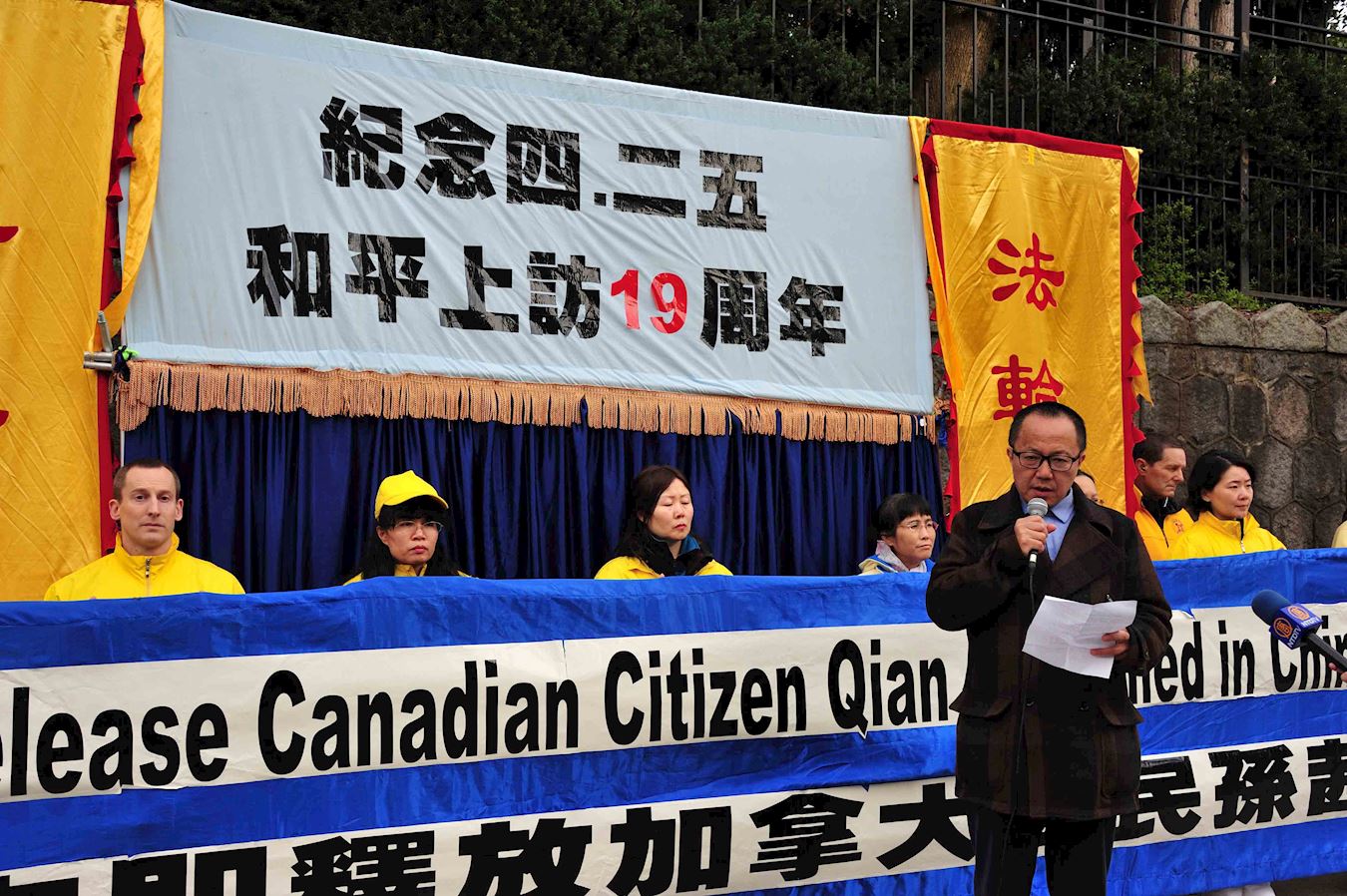 原中国大陆高级法官李建峰先生也特意前来参加法轮功学员的纪念活动并发言。一位居住在中领馆对面十年的Skillen先生和女儿来到活动现场表示敬意和支持。